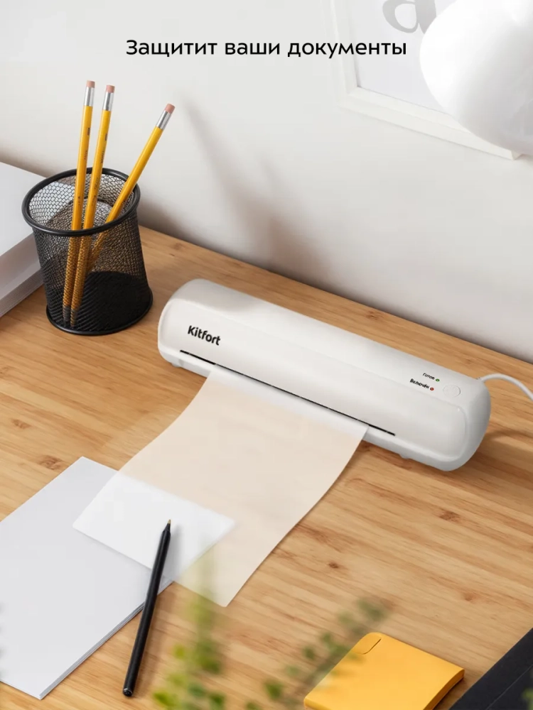 Ламинатор Kitfort КТ-6499 — устройство для ламинирования листов обычной бумаги и фотобумаги. Данная модель является ламинатором пакетного типа, т.е. в качестве ламинирующего материала используется готовый пакет — два листа ламинационной пленки толщиной 60–125 мкм, спаянные с одной стороны. Для работы с ламинатором подходят пакеты, размер которых не превышает формат А4.