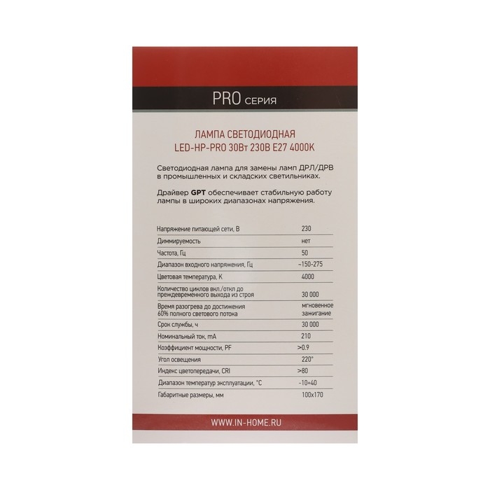 Лампа светодиодная IN HOME LED-HP-PRO, 30 Вт, 230 В, Е27, 4000 К, 2700 Лм