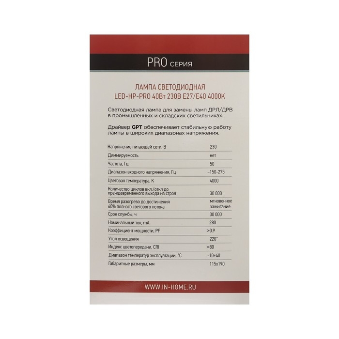 Лампа светодиодная IN HOME LED-HP-PRO, 40 Вт, 230 В, Е27, E40, 4000 К, 3800 Лм, с адаптером
