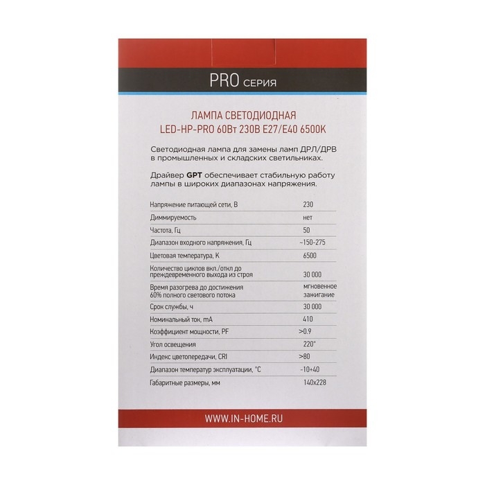 Лампа светодиодная IN HOME LED-HP-PRO, 60 Вт, 230 В, Е27, E40, 6500 К, 5700 Лм, с адаптером