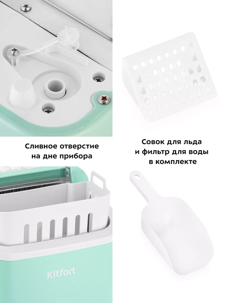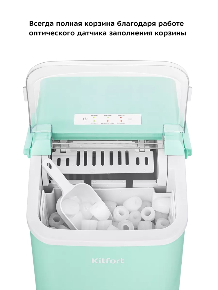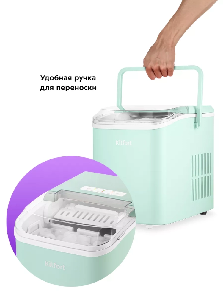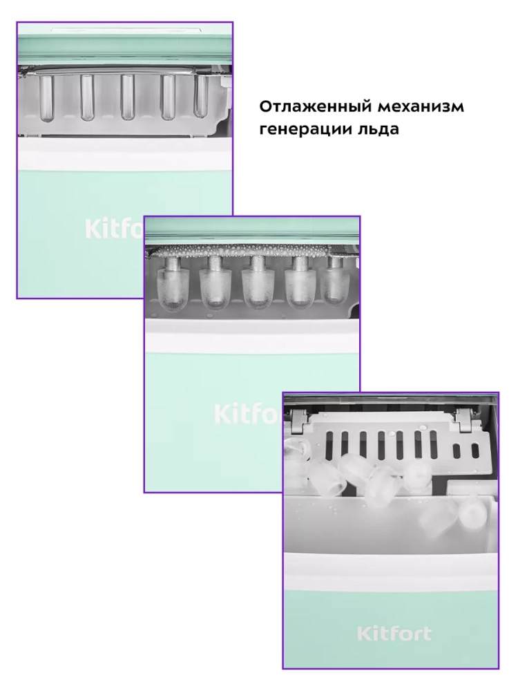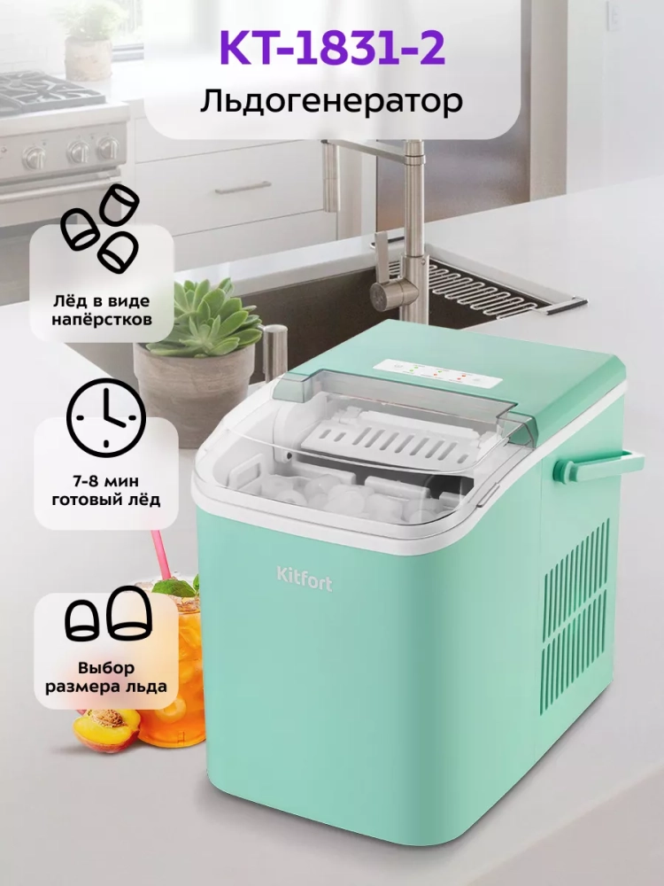 Льдогенератор Kitfort КТ-1831 — прибор, который быстро генерирует лед. Время приготовления одной порции льда занимает 7–8 минут. Лед получается в форме «пальчик/цилиндр» и имеет углубление. Лед такой формы имеет максимальную поверхность теплообмена, поэтому идеально подходит для охлаждения напитков большого объема, например, лонг-дринков. Размер льда можно менять. Благодаря своей форме полученный лед хорошо измельчается блендерами.