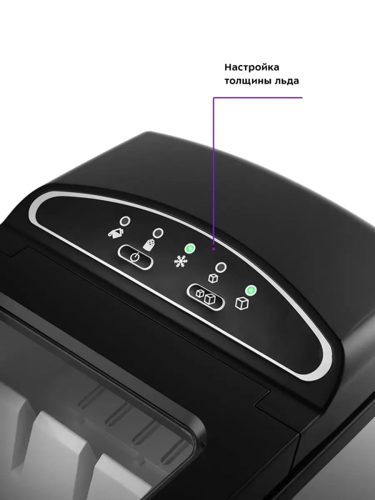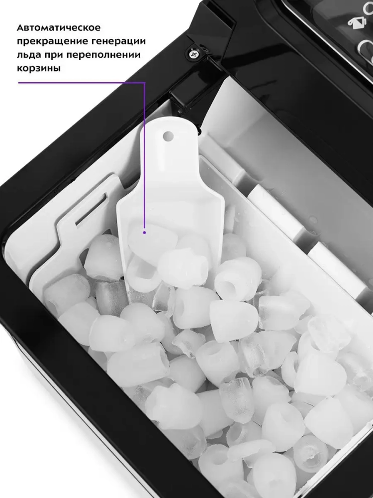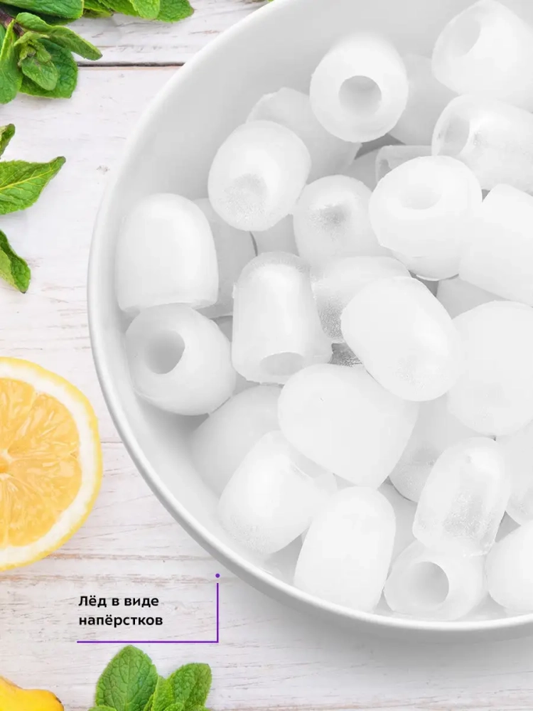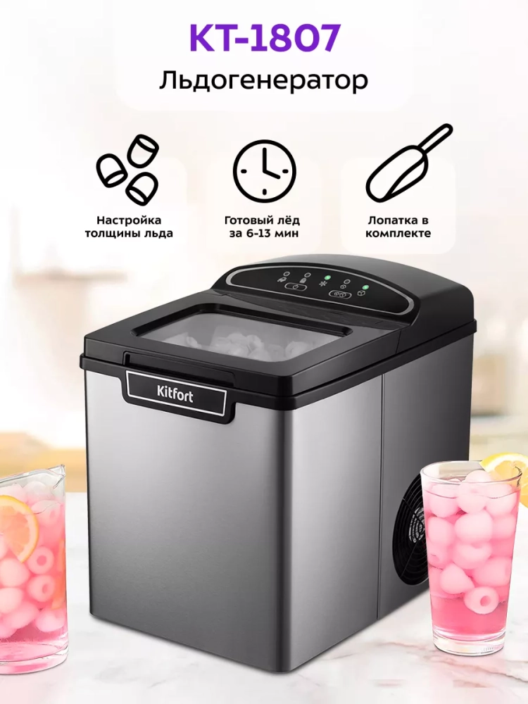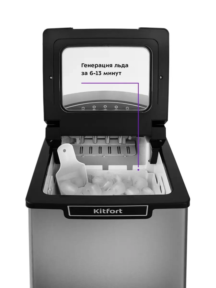 Льдогенератор от Kitfort КТ-1807 - прибор, который быстро генерирует лед, время приготовления льда занимает 6-13 минут. Лед получается в виде наперстков, толщину такого наперстка можно регулировать. Наперсток хорошо измельчается блендерами. Готовый лёд автоматически складывается в специальную корзину. При её переполнении генерация льда прекращается. Готовый лёд не подмораживается, т.е. он постепенно тает, а т.к. стенки льдогенератора термоизолированные - лёд тает довольно медленно. Охлаждение в приборе производится при помощи компрессора с хладагентом R600a по принципу обычного холодильника. Изобутан R600a является экологически чистым, но горючим веществом, он не разрушает озоновый слой и не приводит к увеличению парникового эффекта. Количество хладагента всего 29 г. Вам достаточно просто залить чистую фильтрованную воду в резервуар и нажать на кнопку. Полная корзина льда будет готова примерно через 1 час.