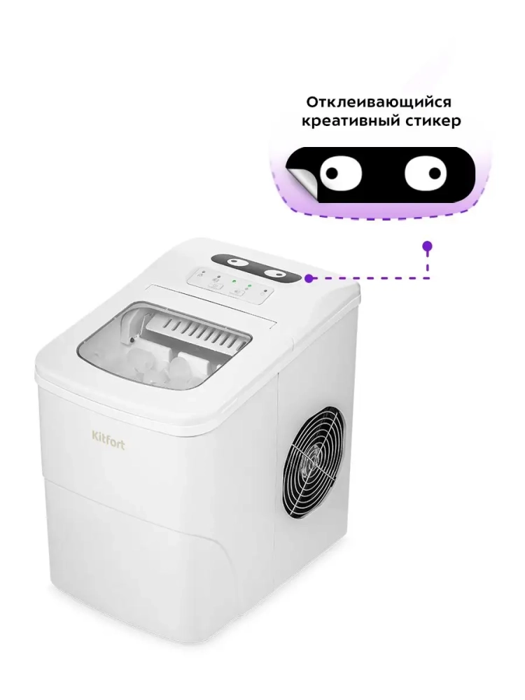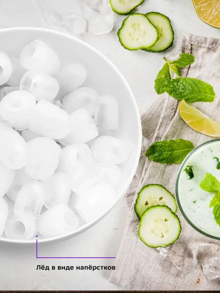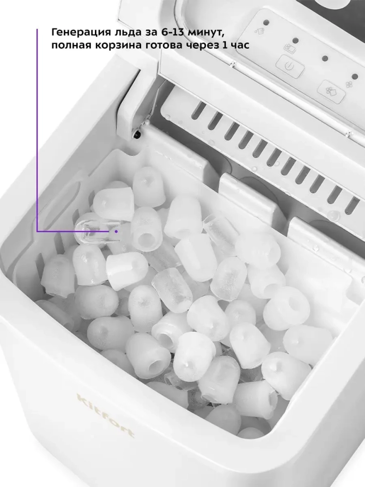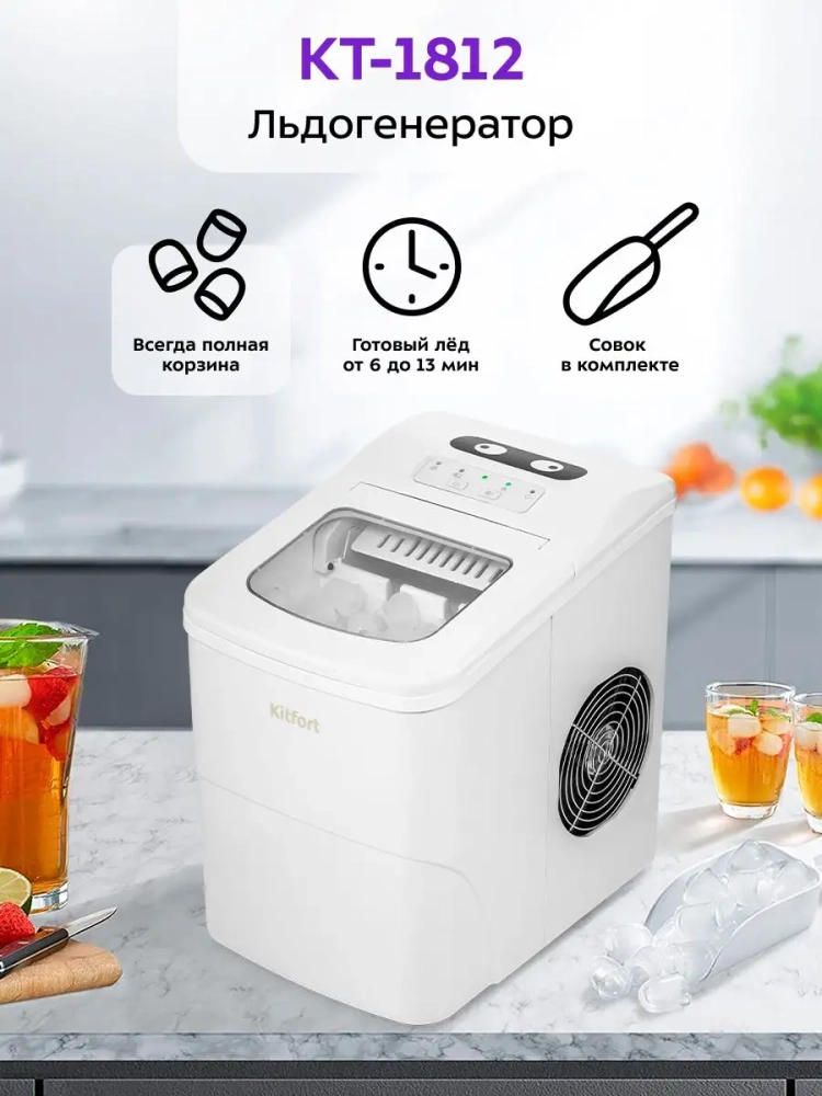 Льдогенератор от Kitfort КТ-1812 — прибор, который быстро генерирует лед. Лед получается в виде наперстков, толщину которых можно регулировать. Лед в виде наперстка хорошо измельчается блендерами. Готовый лед автоматически складывается в корзину — когда корзина будет заполнена, генерация льда остановится. Корзина полностью наполняется льдом примерно за 1 час. Готовый лед не подмораживается, т.е. он постепенно тает. Благодаря тому, что стенки льдогенератора термоизолированные, лед тает довольно медленно.