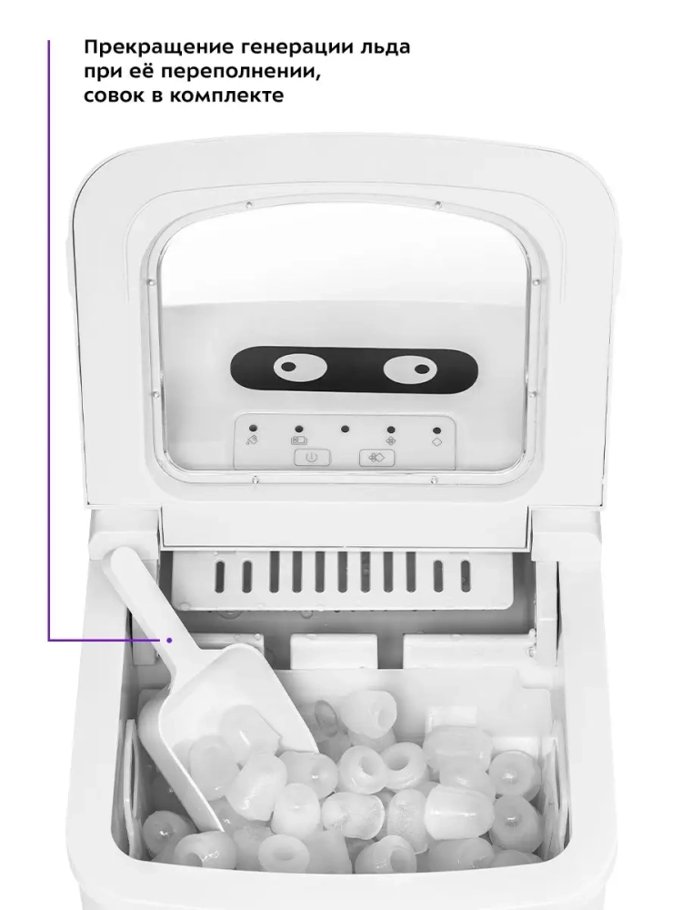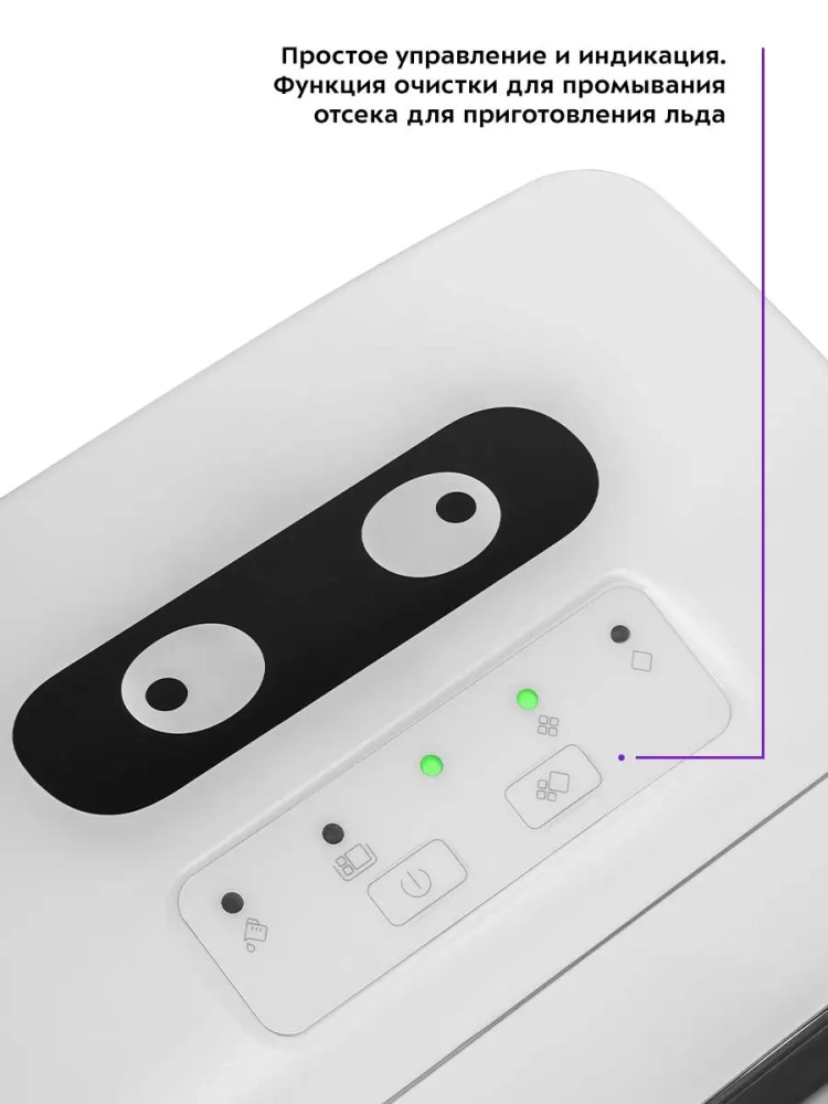 Устройство отличается простым и удобным управлением — чтобы приготовить лед, нужно залить чистую фильтрованную воду в резервуар и нажать на кнопку. В крышке прибора есть смотровое окно, через которое можно наблюдать за процессом генерации льда и наполнением корзины.