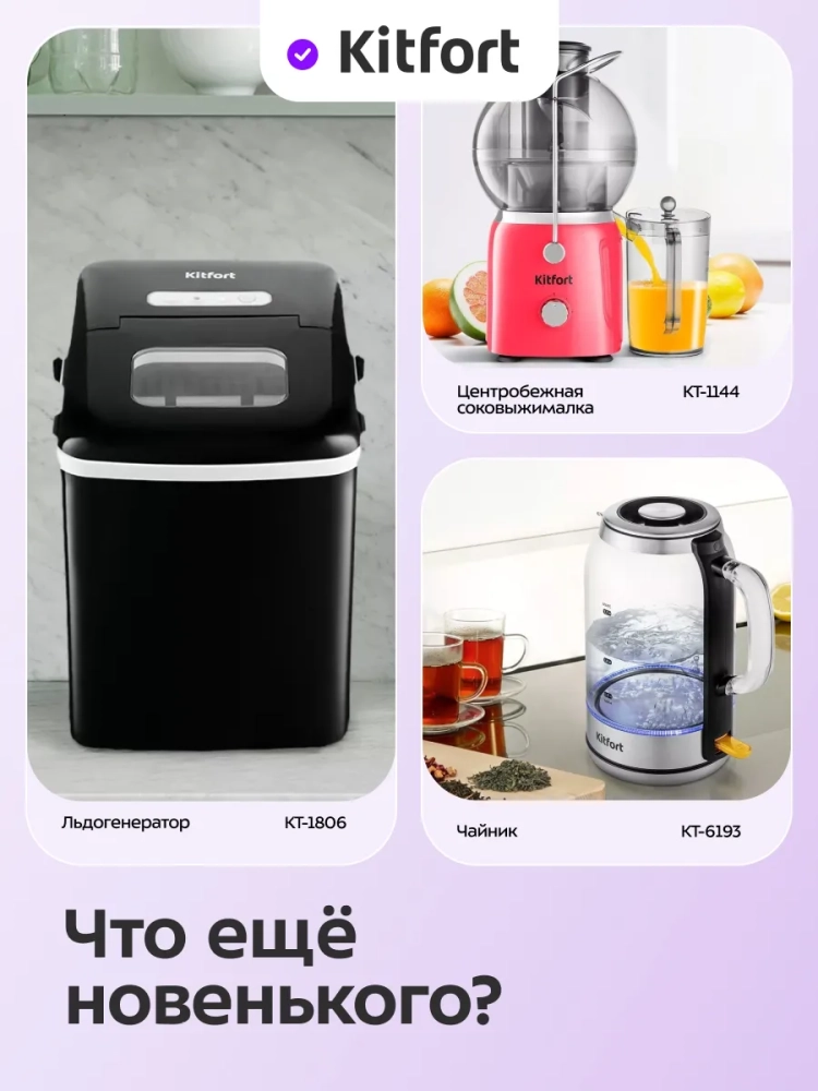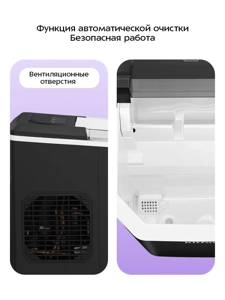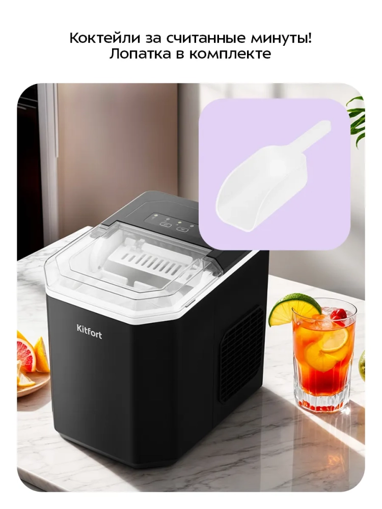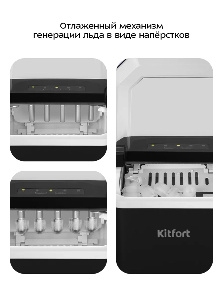 Льдогенератор Kitfort КТ-1840 — прибор, который быстро генерирует лед. Время приготовления одной порции льда занимает 6–13 минут в зависимости от выбранного размера льда и окружающих условий. Лед получается в форме «пальчик/цилиндр» и имеет углубление. Лед такой формы имеет максимальную поверхность теплообмена, поэтому идеально подходит для охлаждения напитков большого объема, например, лонг-дринков. Размер льда можно менять. Благодаря своей форме полученный лед хорошо измельчается блендерами.