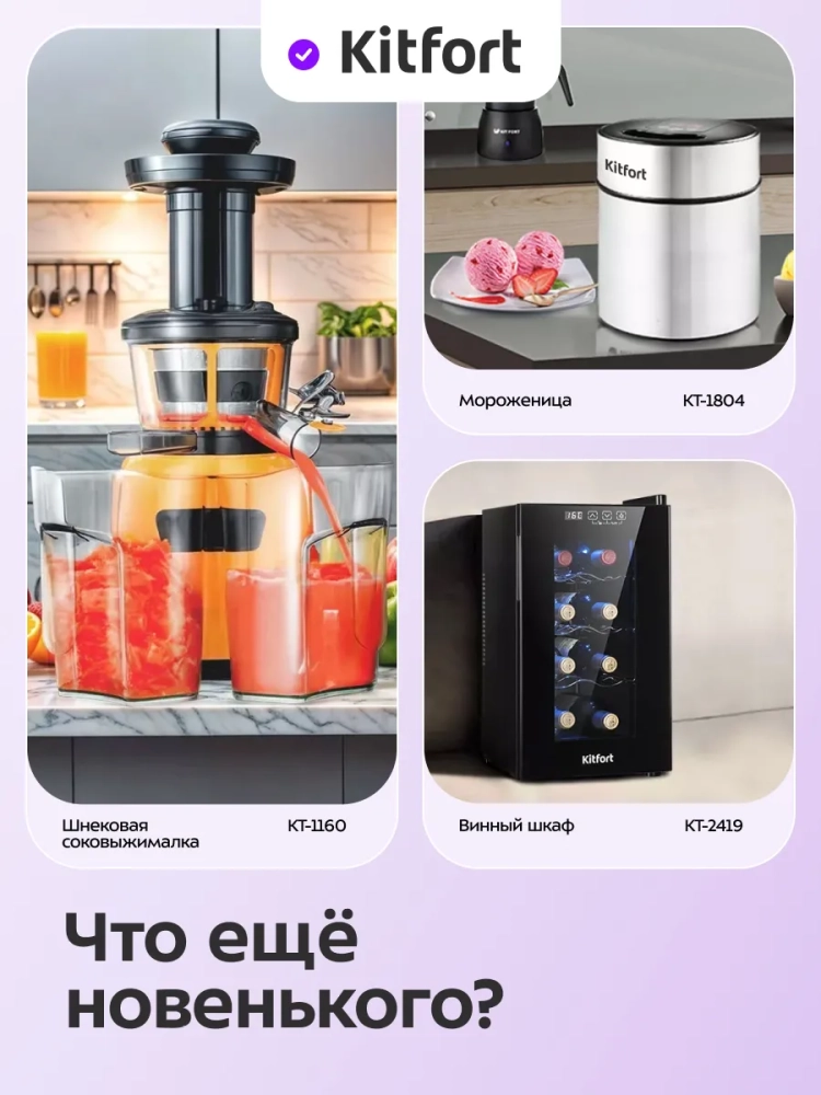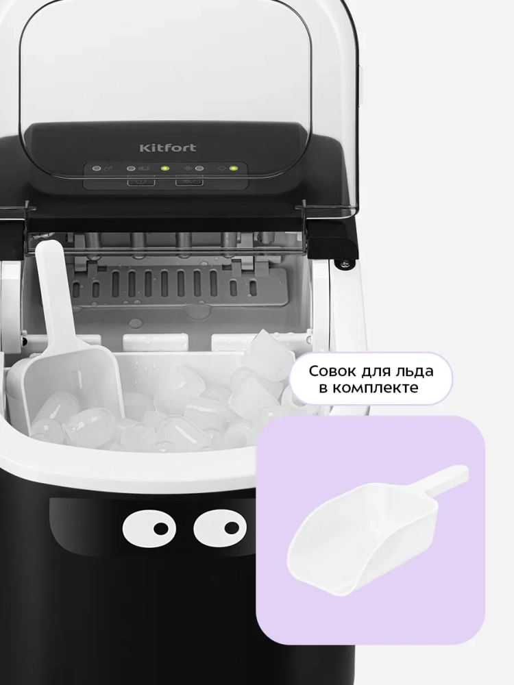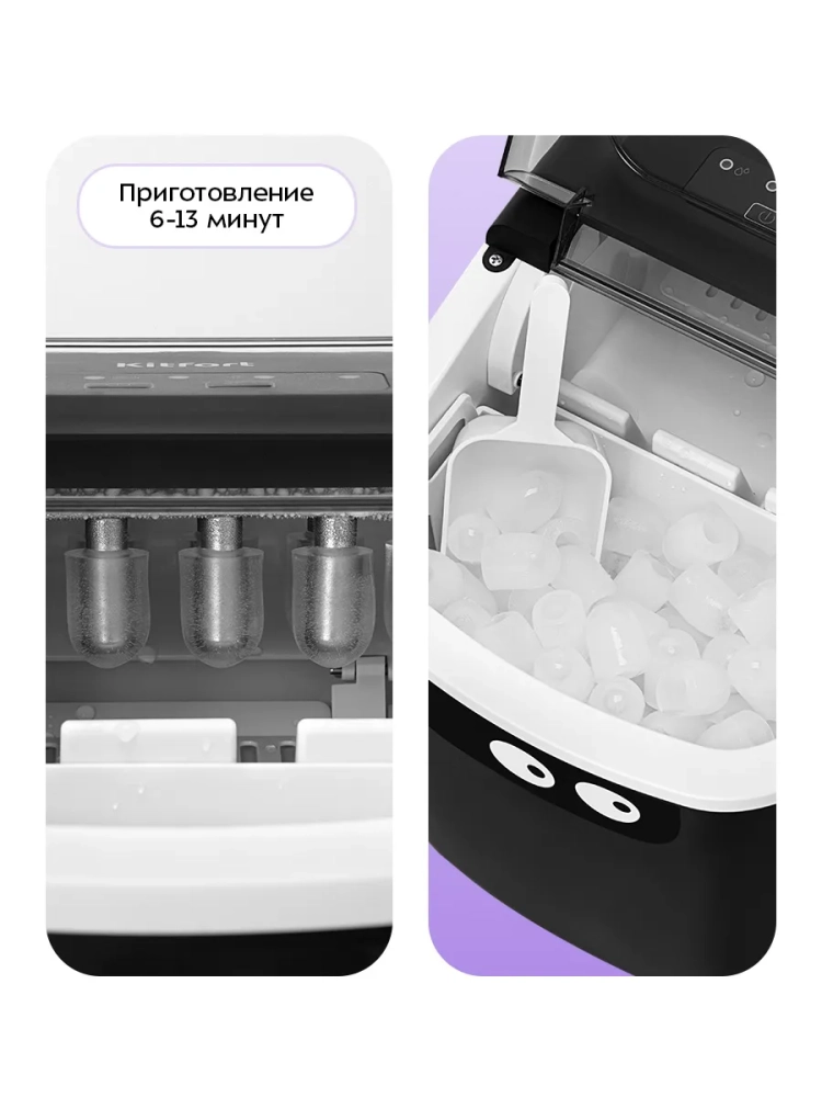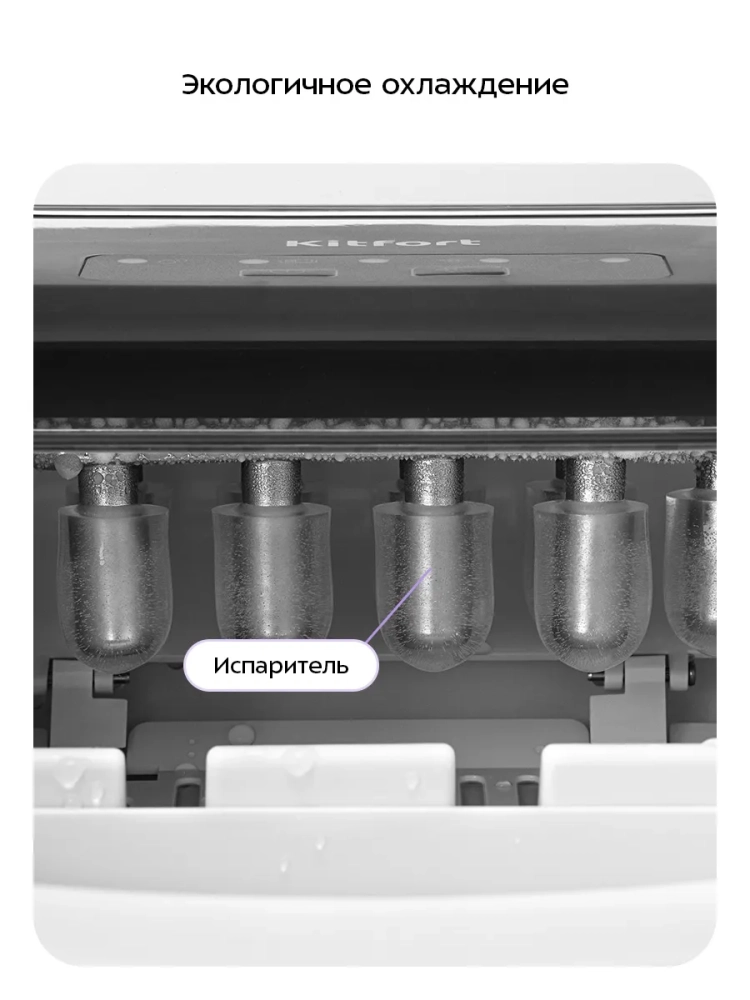 Льдогенератор Kitfort КТ-1845 — прибор, который быстро генерирует лед. Время приготовления одной порции льда занимает 6–13 минут в зависимости от выбранного размера льда и окружающих условий. Лед получается в форме «пальчик/цилиндр» и имеет углубление. Лед такой формы имеет максимальную поверхность теплообмена, поэтому идеально подходит для охлаждения напитков большого объема, например, лонг-дринков. Размер льда можно менять. Благодаря своей форме полученный лед хорошо измельчается блендерами.