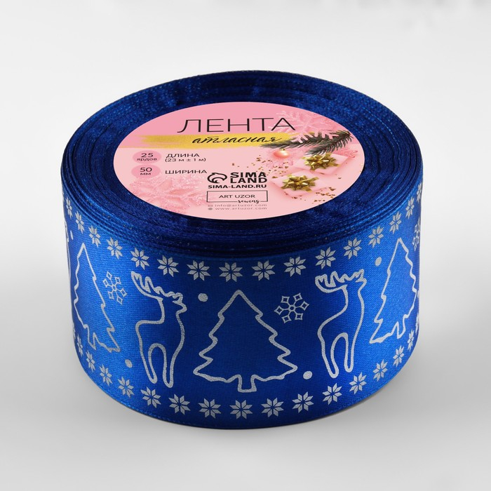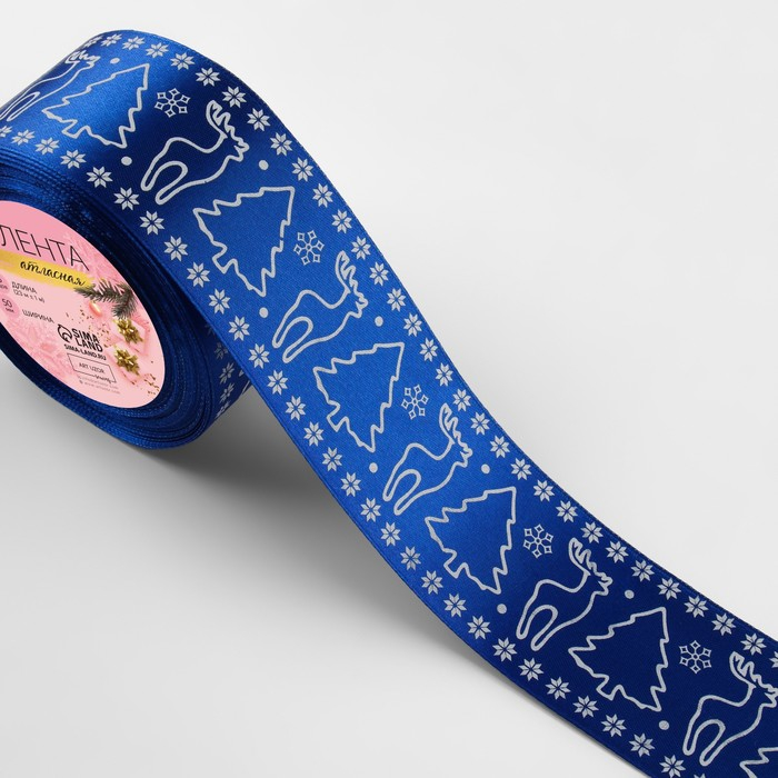 Лента атласная «Олени», 50 мм, 23 ± 1 м, цвет синий №122