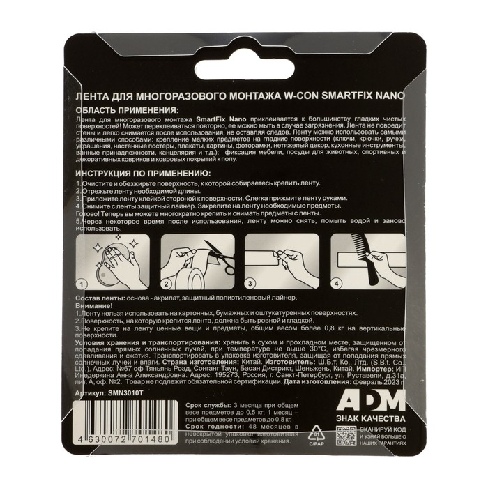 Лента для многоразового монтажа W-con SmartFix NANO, 3 х 100 см