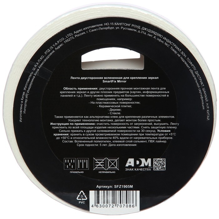 Лента двусторонняя для крепления зеркал SmartFix MIRROR - это практичное средство для безопасного монтажа зеркал и других предметов без необходимости сверлить отверстия или использовать клей. Вот некоторые ключевые характеристики этой вспененной ленты: