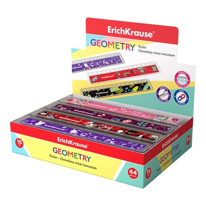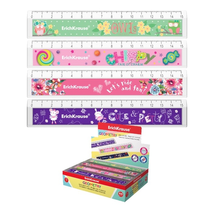 Линейка 15 см дизайн ErichKrause, с выемкой, микс *4 вида, в дисплее (girl)