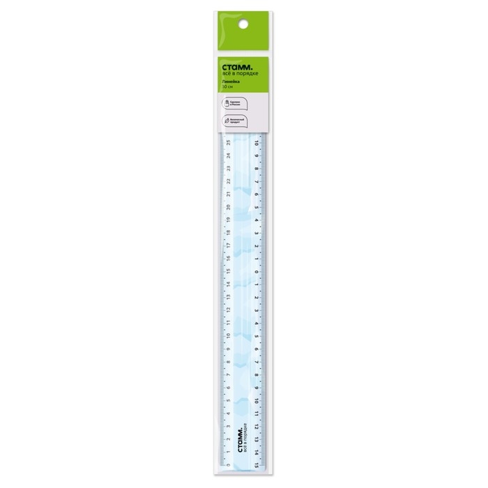 Линейка «СТАММ» предназначена для выполнения чертёжных и измерительных работ. Изделие имеет контрастную миллиметровую шкалу. Длина шкалы – 30 см, ширина линейки – 35 мм. Изделие имеет безопасные закруглённые края. Изготовлена из качественного полистирола, и имеет гладкую глянцевую поверхность. Упакована в пакет с европодвесом. Линейка выполнена в оригинальном и ярком дизайне.