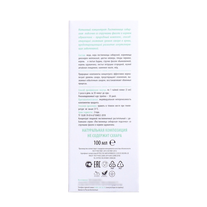 Лиственница сибирская подсочка "Исчезающий диабет" с фасолью и корнем одуванчика, 100 мл
