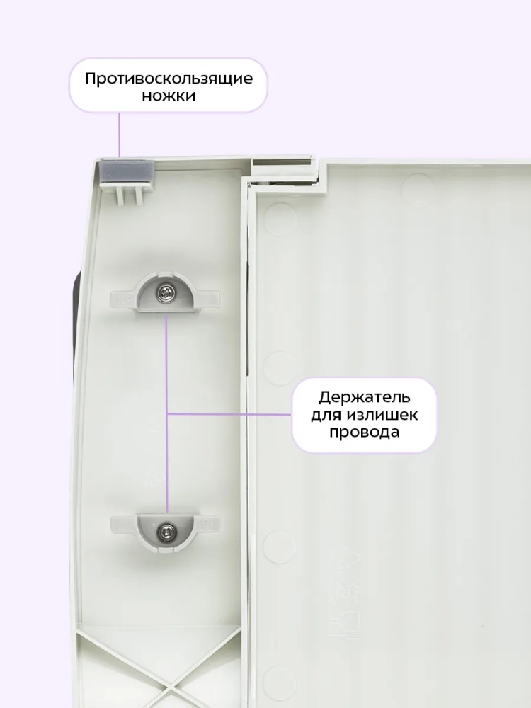 В данном приборе предусмотрены противоскользящие ножки, чтобы сделать его более устойчивым. На дне есть держатели для шнура питания, на которые можно смотать его излишки, чтобы шнур питания не мешал во время работы.
