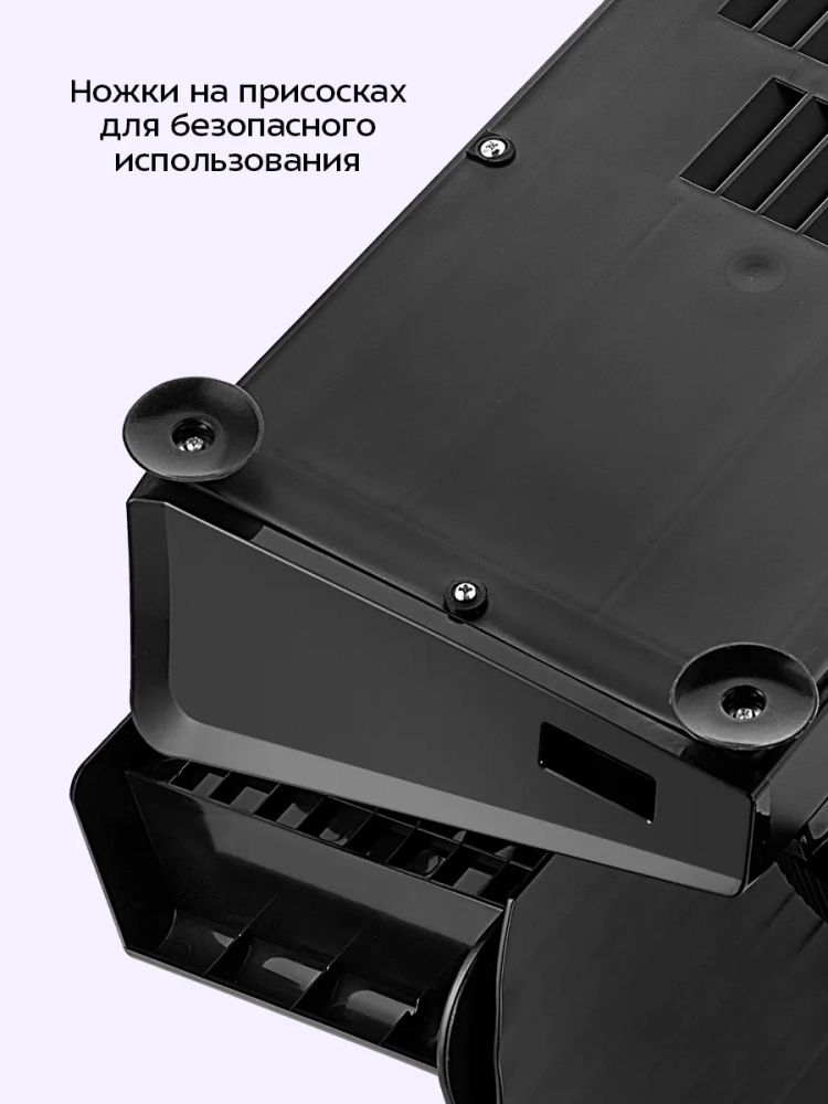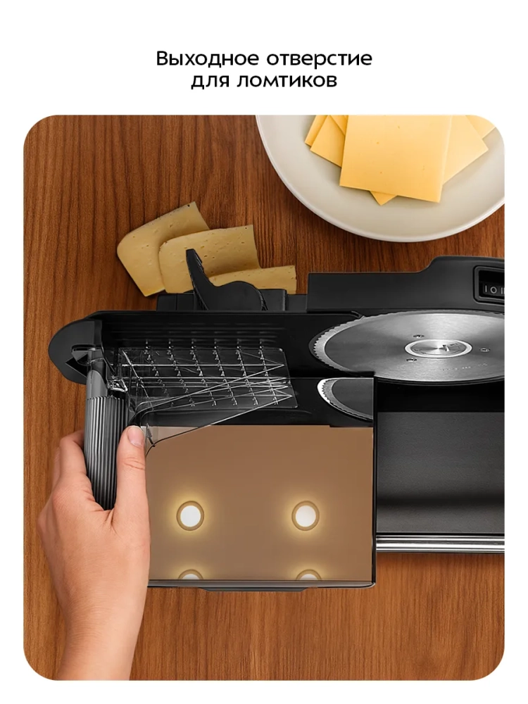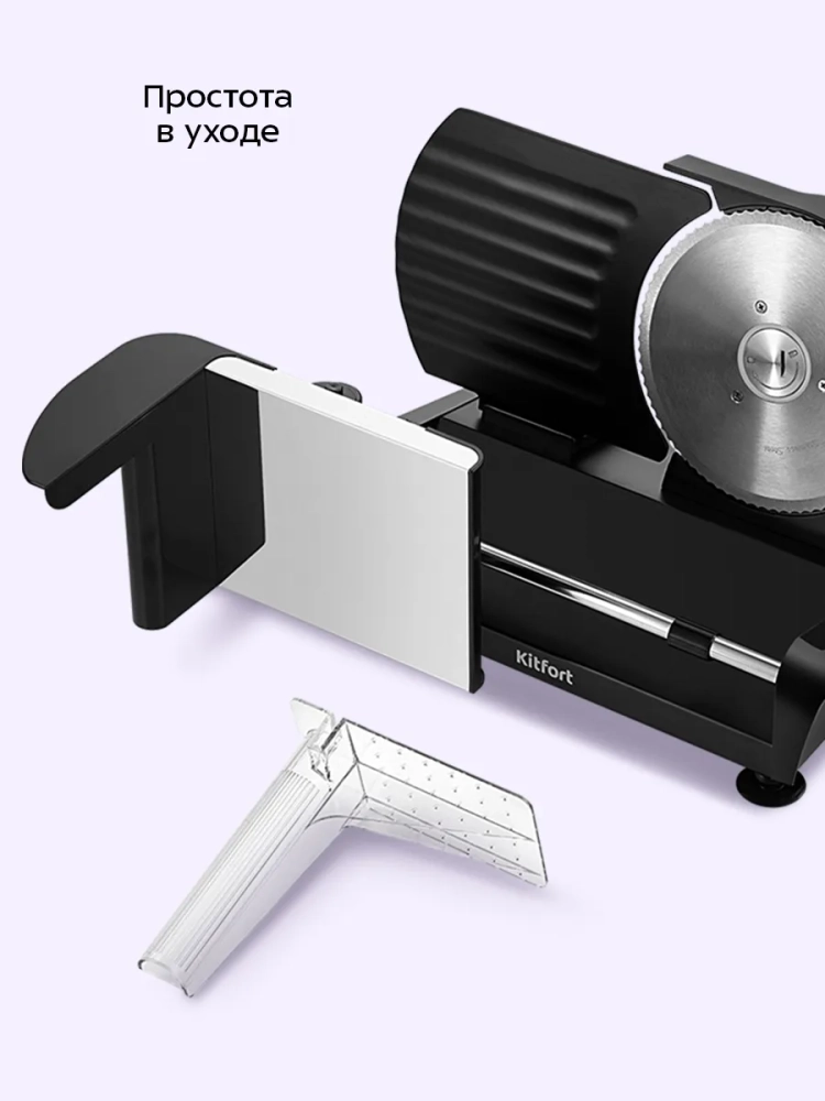 Дисковый нож легко снять для заточки или очистки. Толкатель, непосредственно контактирующий с продуктом, также съемный, что облегчает очистку устройства. Снизу прибора предусмотрены противоскользящие ножки с присосками для устойчивости.