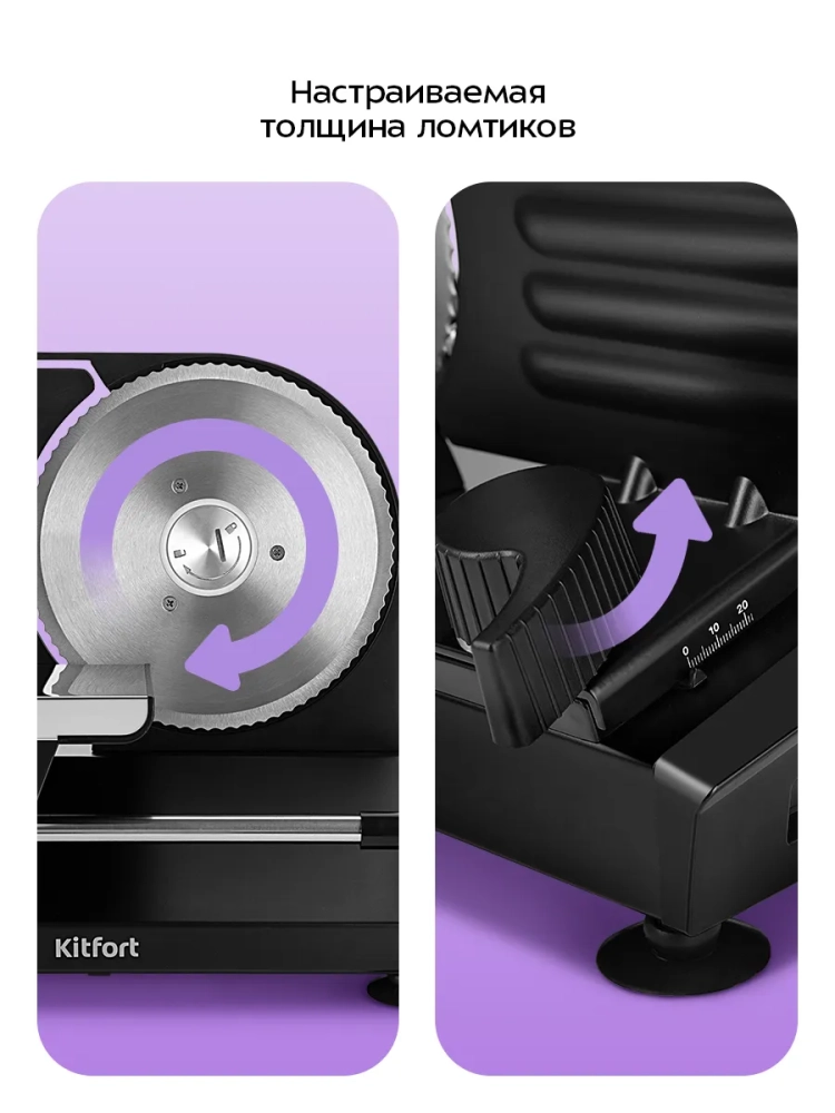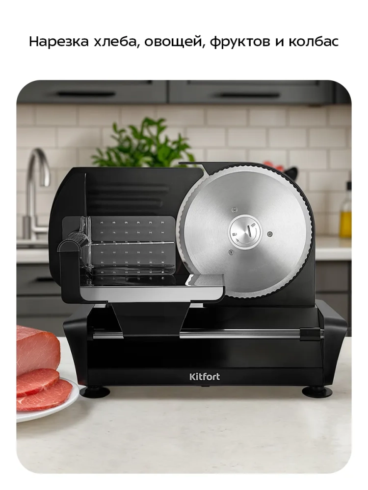 Ломтерезка Kitfort КТ-9955 предназначена для нарезки хлеба, овощей, фруктов, колбас, сыров, рыбы и готового мяса. С ее помощью можно быстро и аккуратно нарезать одинаковые ломтики для приготовления различных блюд. Тонко нарезанные продукты выглядят более аппетитно и делают даже простое блюдо интересным. Вы также можете подготовить овощи, фрукты или мясо для сушки в духовке или сушилке. С помощью ломтерезки вы существенно сократите время нарезки и получите ровные ломтики, добиться которых при нарезке обычным ножом очень непросто.