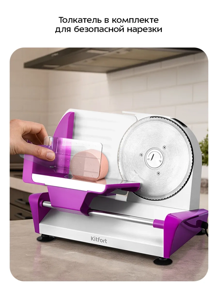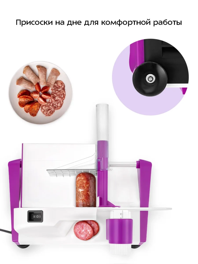 Дисковый нож легко снять для заточки или очистки. Толкатель, непосредственно контактирующий с продуктом, также съемный, что облегчает очистку устройства. Снизу прибора предусмотрены противоскользящие ножки с присосками для устойчивости.