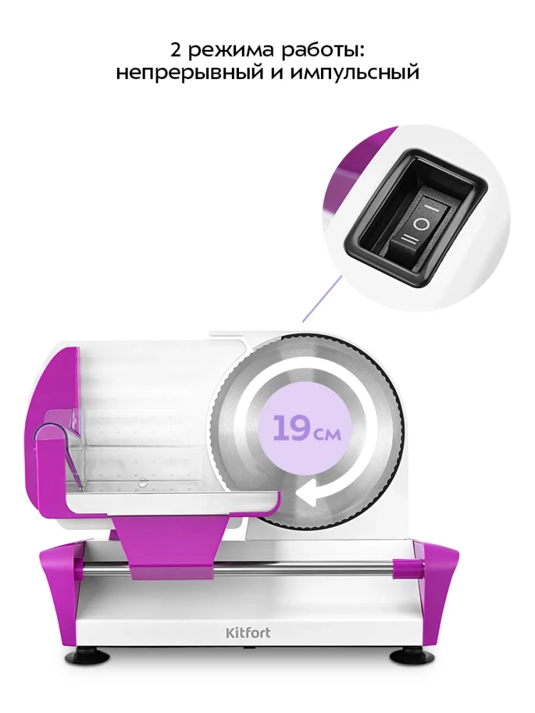 Устройство оснащено переключателем, который позволяет выбрать один из двух режимов работы: «I» — режим непрерывной нарезки или «II» — импульсный режим. Скорость вращения ножа в обоих режимах одинаковая.