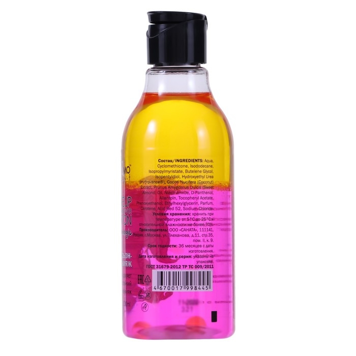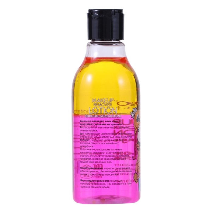 Способ применения: перед использованием взболтай двухфазное средство для удаления макияжа. Нанеси нужное количество лосьона на ватный диск и легкими движениями сними макияж с лица.