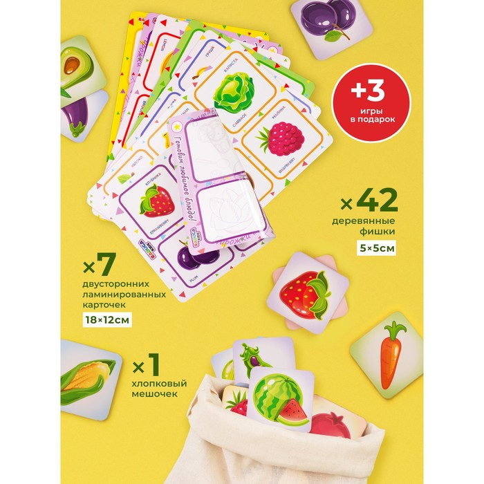 Лото «Фрукты-овощи» — развивающая настольная игра, с помощью которой ребёнок узнает много нового, в том числе то, как пишутся названия продуктов на русском и английском языках.