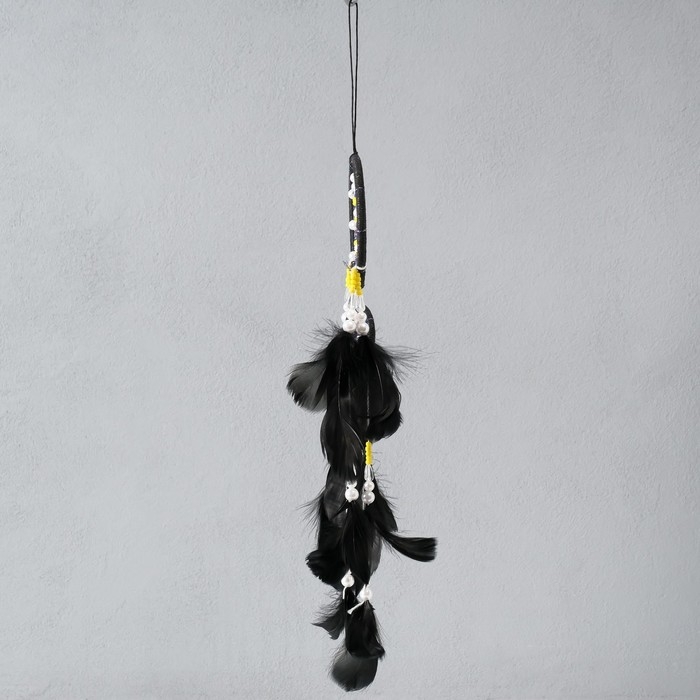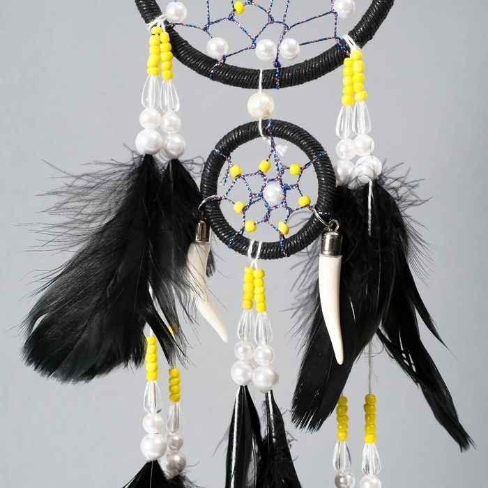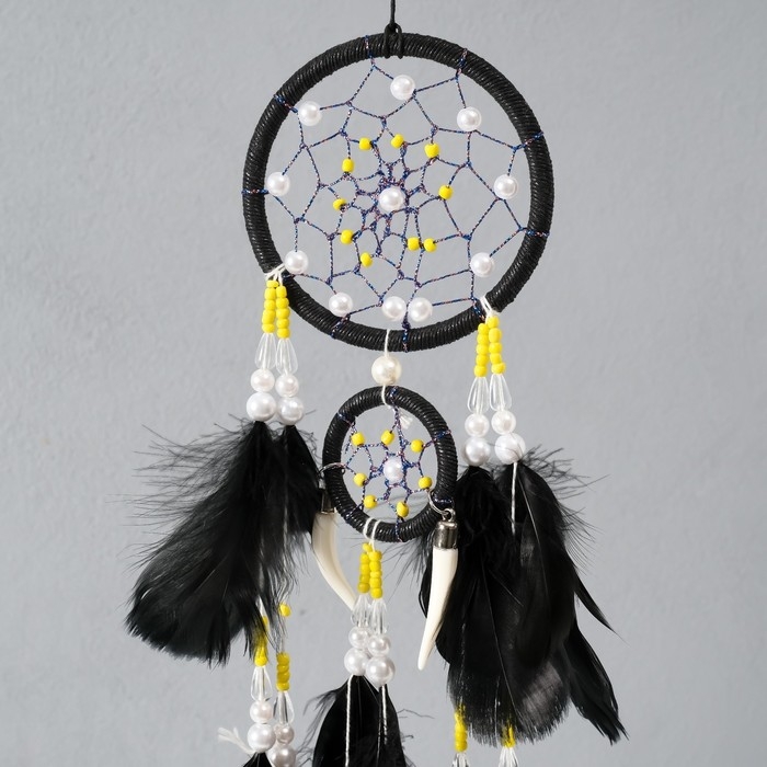 Ловец снов d=10 и 5 см "Паутинка с белыми и желтыми бусинами" черный 50х10х0,7 см