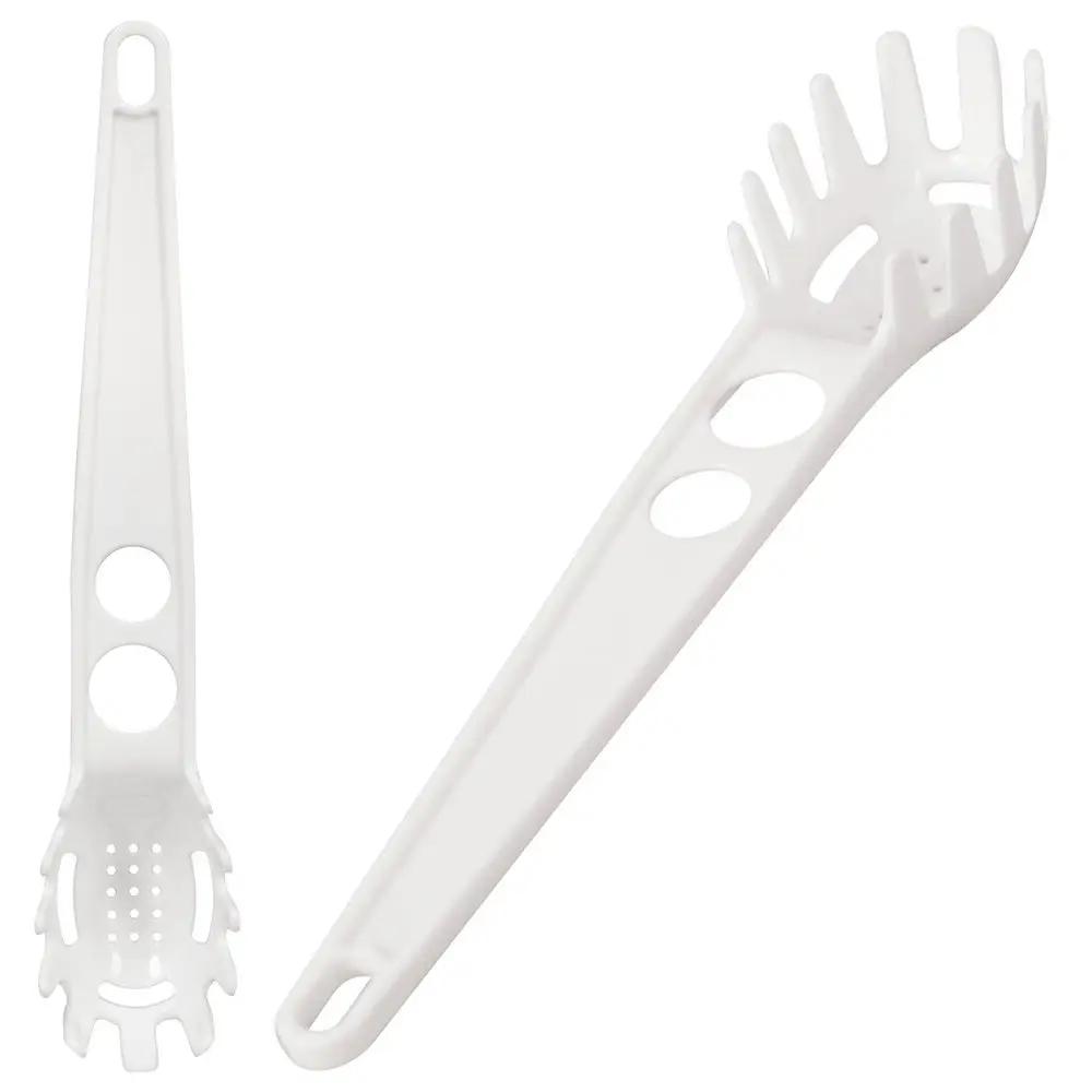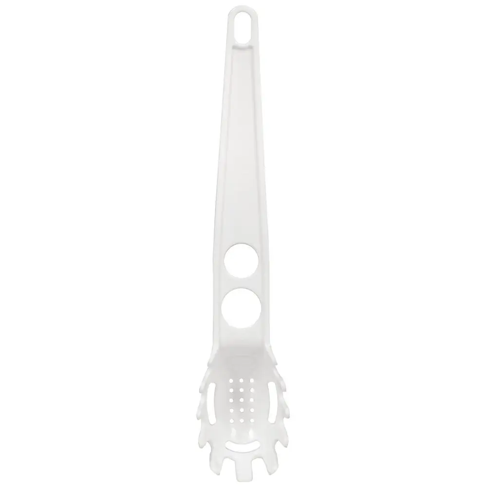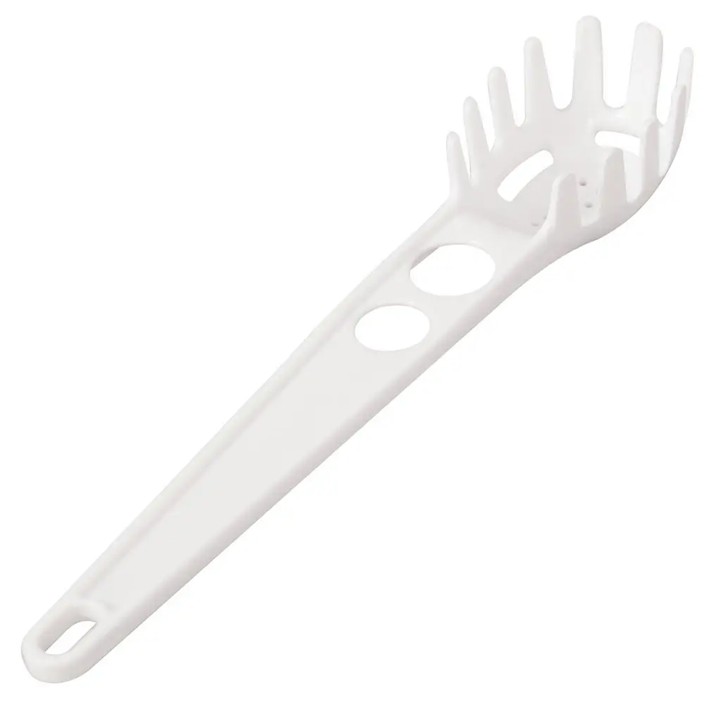 Ложка пригодится при приготовлении спагетти и других блюд. На ручке расположены специальные отверстия, с помощью которых можно отмерять определенное количество порций спагетти. Большие зубцы обеспечивают зацеп макаронных изделий, что облегчает процесс приготовления. В центре ложки предусмотрены отверстия для слива лишней жидкости. Изготовлено из пластмассы (полипропилен). Размер: общая длина 26,5 см.