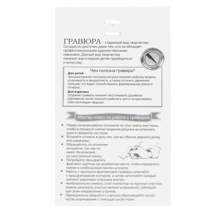 Гравюра представляет собой многослойное панно, покрытое краской, на которое нанесён контур рисунка. С помощью особого скребка (штихеля), который входит в набор, путём процарапывания и создается гравюра.