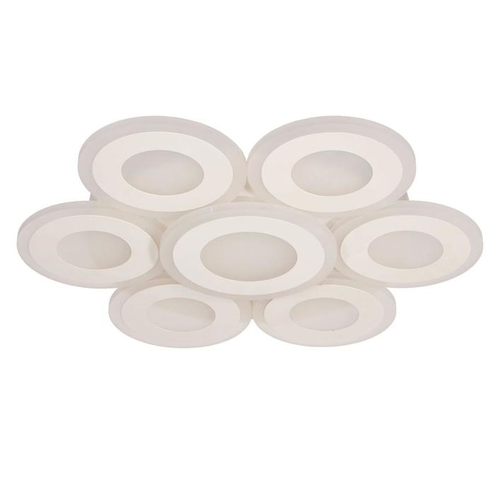 Изделие выполнено из качественного акрила, металла и светодиодов. Срок службы люстры в домашних условиях — 20 000 часов. Подходит для помещений с низкими потолками и для натяжных потолков. Осветит комнату площадью до 27 м².