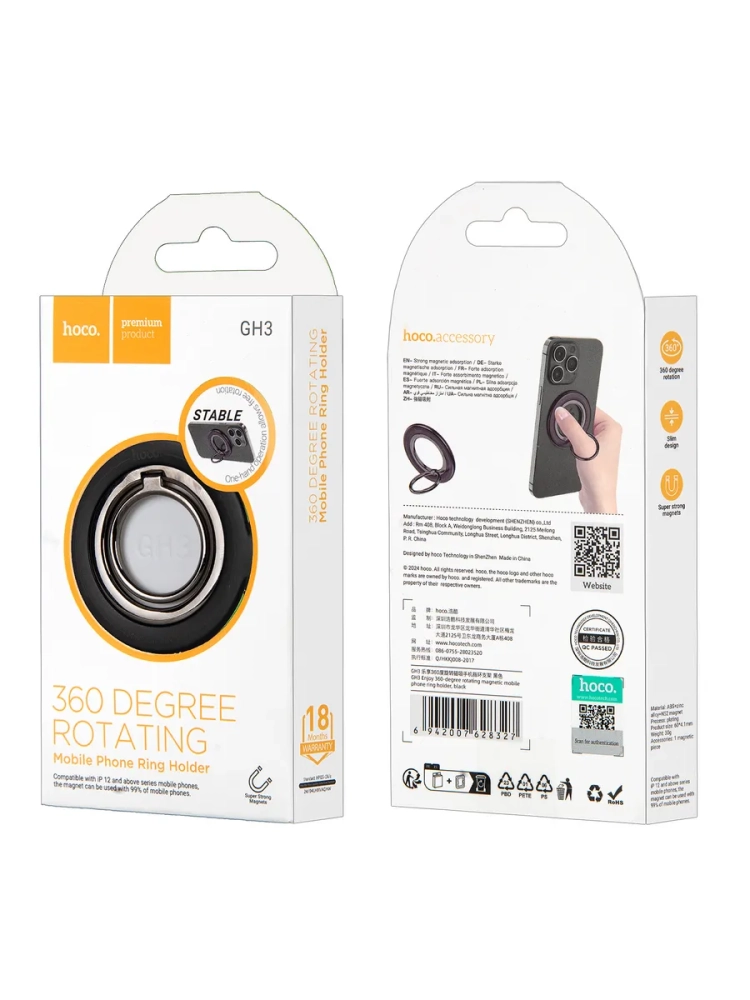 Магнитное кольцо-держатель Hoco GH3 Enjoy 360 Magnetic – универсальное решение для вашего смартфона Инновационный держатель с 360-градусным вращением Hoco GH3 Enjoy 360 Magnetic – это современный магнитный держатель для телефона, который сочетает в себе функциональность, надёжность и стильный дизайн. Благодаря инновационной конструкции и качественным материалам, этот аксессуар станет незаменимым помощником для работы и развлечений.