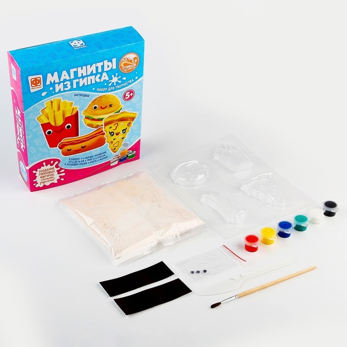 Магниты из гипса 4 в 1 «Весёлые фастфудики» позволяют ребёнку создать уникальные украшения для интерьера или оригинальные подарки для родных и друзей.