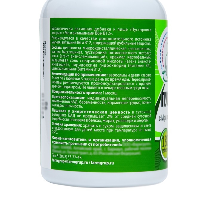 Состав: Целлюлоза микрокристаллическая (наполнитель), магния бисглицинат, пустырника пятилопастного экстракт, тальк (агент антислеживающий), крахмал картофельный, кальциевая соль стеариновой кислоты (агент антислеживающий), пиридоксина гидрохлорид (витамин В6), цианокобаламин (Витамин В12).