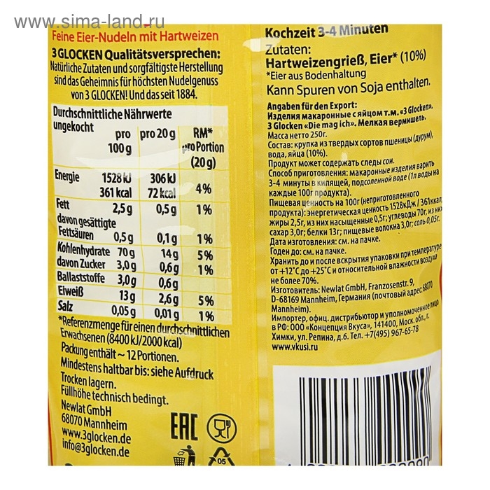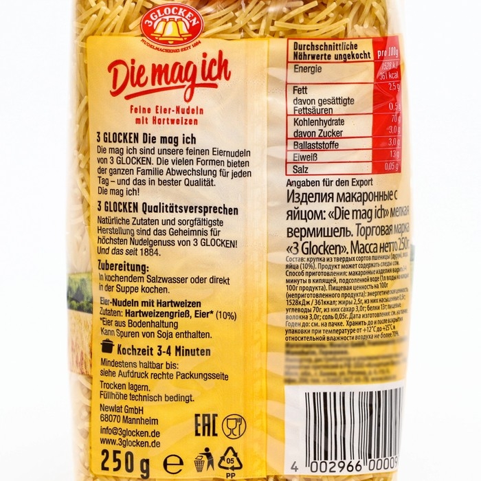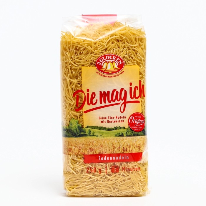 Мелкая вермишель бренда 3 Glocken - натуральные макаронные изделия немецкого производства, изготовленные из муки твердых сортов пшеницы (дурум) с добавлением яиц высшего качества и родниковой воды.