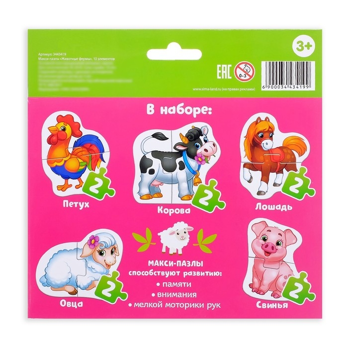Макси-пазлы «Животные фермы» — это 10 деталей, из которых ребёнок соберёт 5 разных пазлов и познакомится с животными фермы. Макси пазлы помогут развить усидчивость, координацию и мелкую моторику рук, а также научат находить связь между частью и целым.