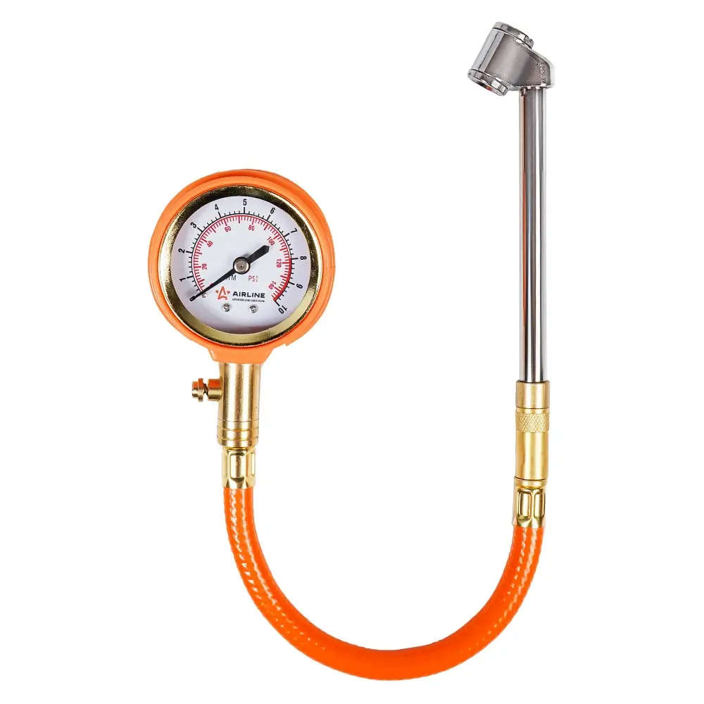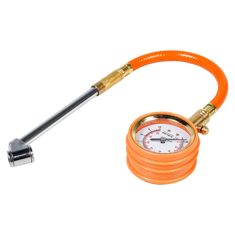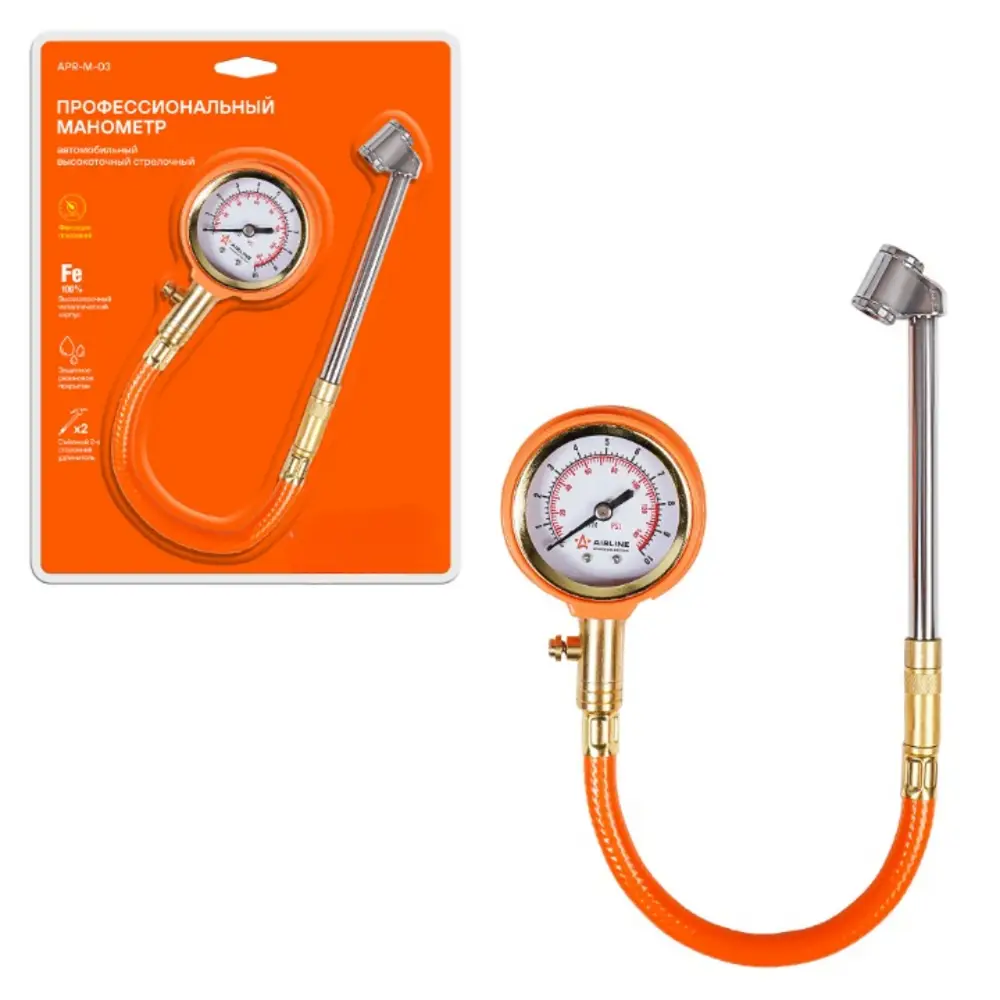 Устройство для измерения давления в шинах автомобиля. Манометр профессионального уровня имеет прочный металлический корпус, гибкий шланг и удлинённую металлическую штангу. Специальная двусторонняя присоединительная головка позволяет без проблем измерять давление на спарке колёс грузовых автомобилей.