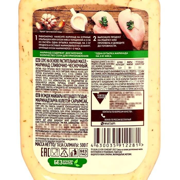 Маринад сливочно-чесночный - это универсальное сочетание нежных сливок с ярким вкусом чеснока и душистым укропом. Маринад идеально подойдёт для курицы, разных видов мяса, овощей, приготовленных на огне или в духовке. Благодаря комбинации фруктово-винных кислот на маринование уходит всего от 30 минут. Маринад можно использовать для приготовления блюд на огне, гриле или в духовке. Одна бутылка рассчитана на 3 кг мяса или курицы.