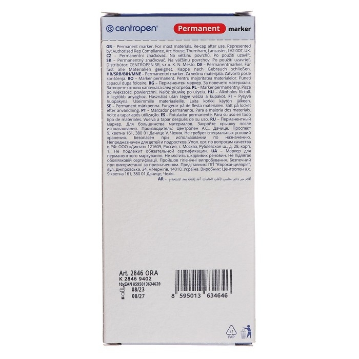 Centropen 2846 — это перманентый маркер, который предназначен для письма на любых поверхностях.