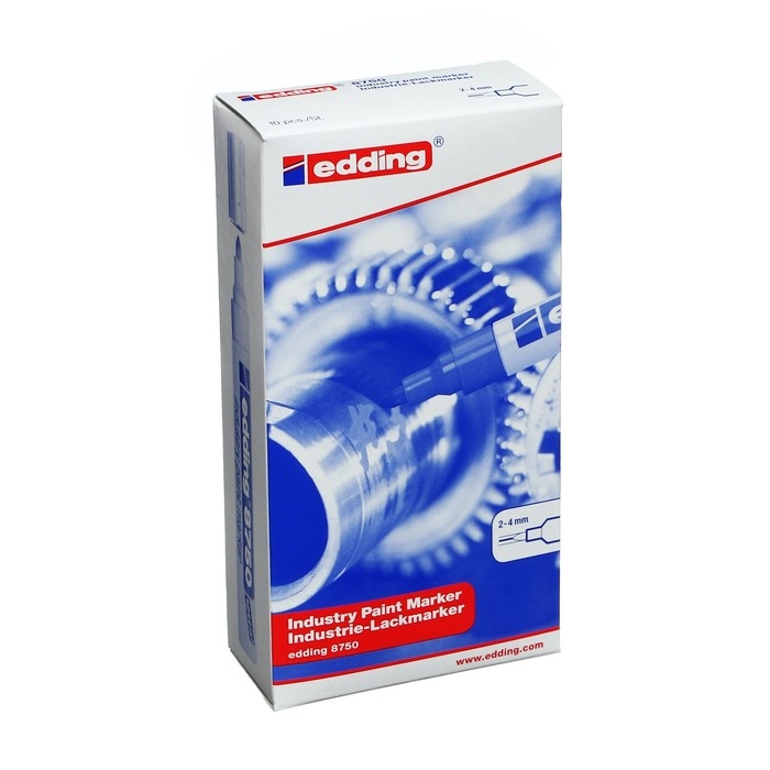 Промышленный лаковый маркер для промышленной, индустриальной графики, с пулевидным наконечником повышенной устойчивости к истиранию. Маркер универсален для нанесения маркировки и надписей в сложных, агрессивных промышленных условиях. Хорошо подходит для письма на грязных, жирных поверхностях. Выдерживает воздействие кислотами, растворителями, механическому воздействию. Стойкие чернила, ложатся густым плотным слоем с лаковым эффектом на гладкие и пористые поверхности. Надписи хорошо видно издалека на темных поверхностях. Специально разработанный состав маркера Edding 8750 растворяют масляную пленку на поверхности письма. Температурный режим краски маркера 1000 °C. Максимальная температура поверхности при написании маркером не более 100 градусов по Цельсию. Толщина линии 2–4 мм. Размеры маркера: диаметр 15 мм, длина 141 мм.