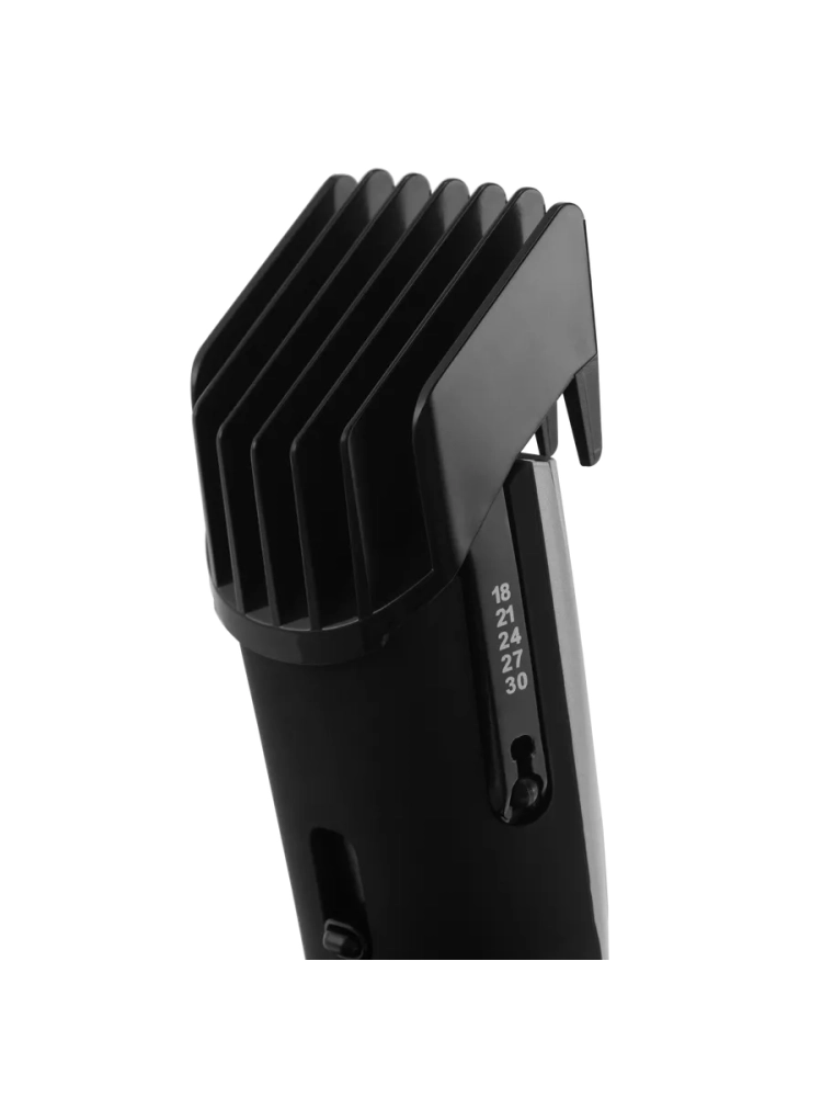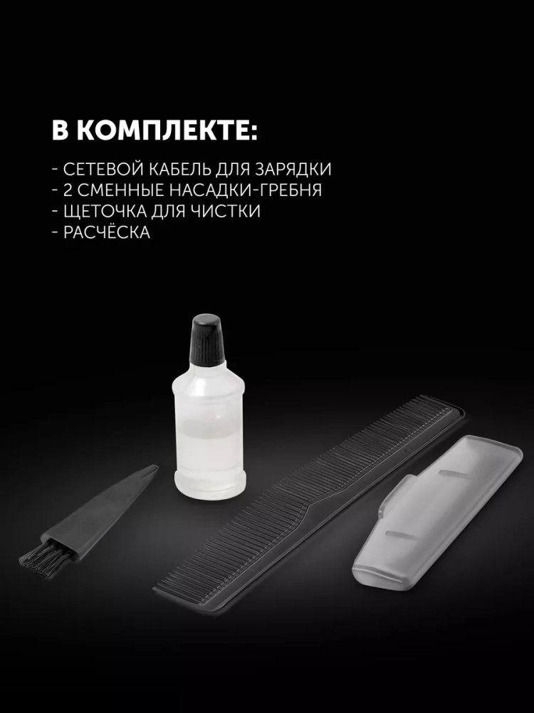 Устройство работает как от сети, так и от аккумулятора без проводов. Цифровой дисплей отображает индикацию работы и уровень заряда батареи. В набор входят также 2 сменные насадки, расческа, масло и щеточка.