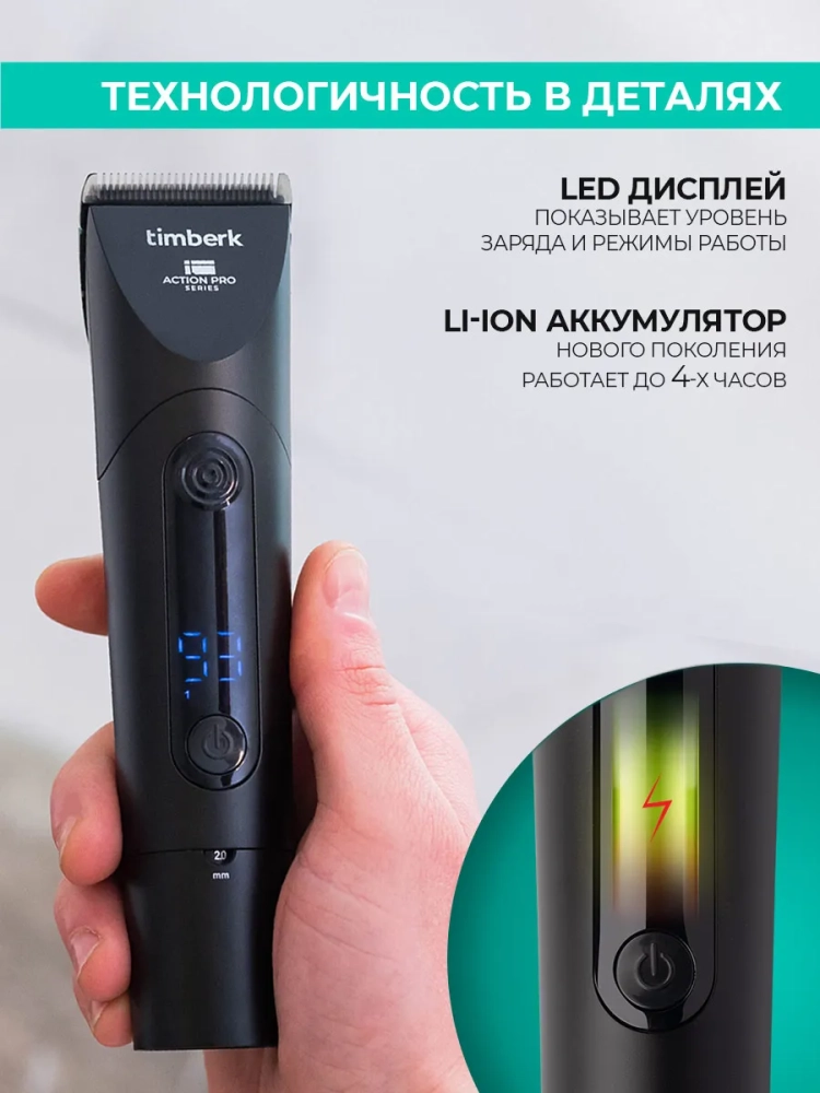 Дополнительно модель имеет LED дисплей с индикацией уровня заряда, 3 режима работы для разного типа и густоты волос, технологию влагозащиты для мытья лезвий после стрижки. Функция plug and play позволяет использовать прибор как от аккумулятора, так и от сети (с помощью USB шнура). Заряжать прибор можно одним из 2-х кабелей, входящих в комплект, а также, установив машинку для стрижки на зарядную станцию.