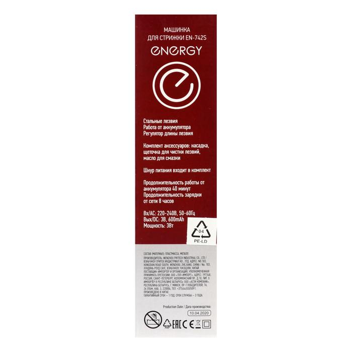 Машинка для стрижки ENERGY EN-742S, 3 Вт, 1 насадка, 1-12 мм, сталь, АКБ, синяя