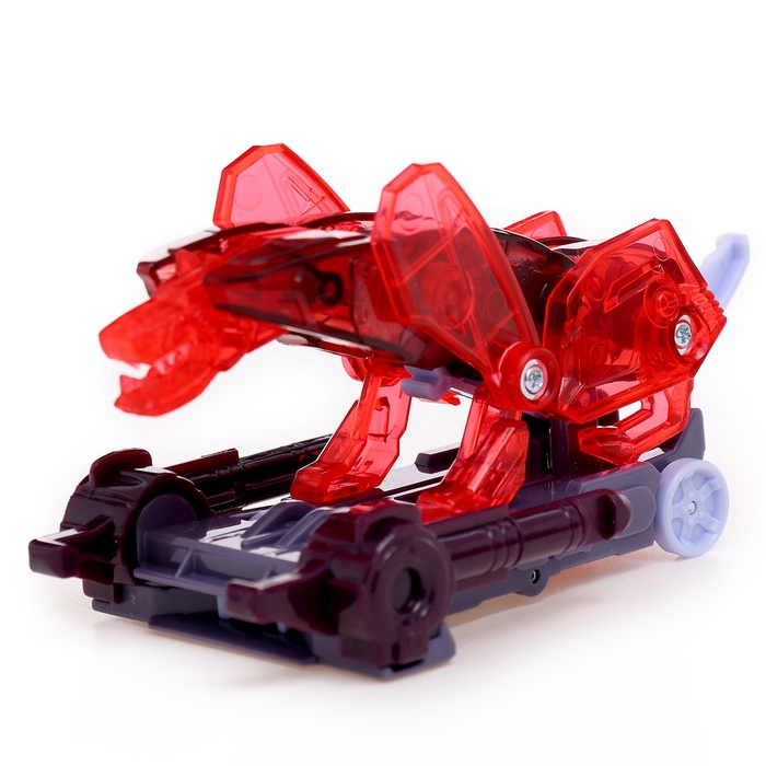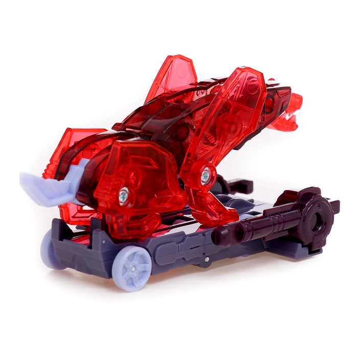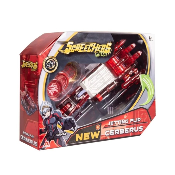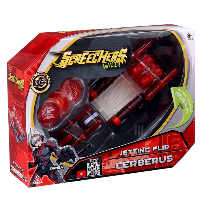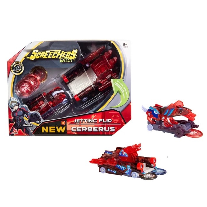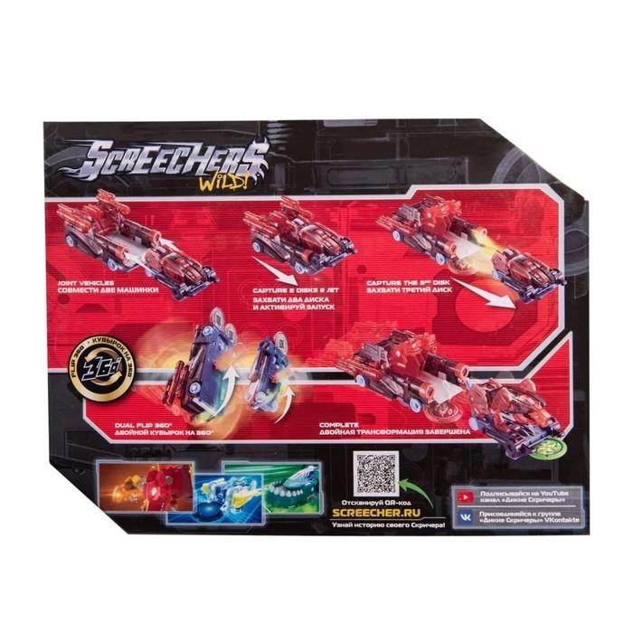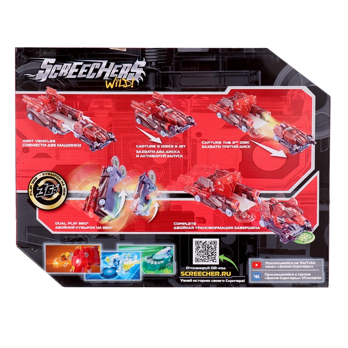 Отличительная особенность турбоскричера — синхронная трансформация! В игровой набор входит две машинки: одна из них захватывает два диска, катапультирует вторую машинку, и они одновременно трансформируются! Машинка-трансформер превращается в зверя, переворачиваясь в воздухе на 360 градусов!