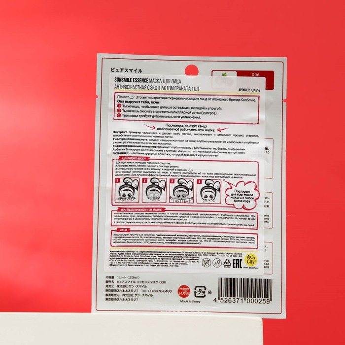 Маска для лица SUNSMILE Essence «Антивозрастная», с экстрактом граната, 1 шт.