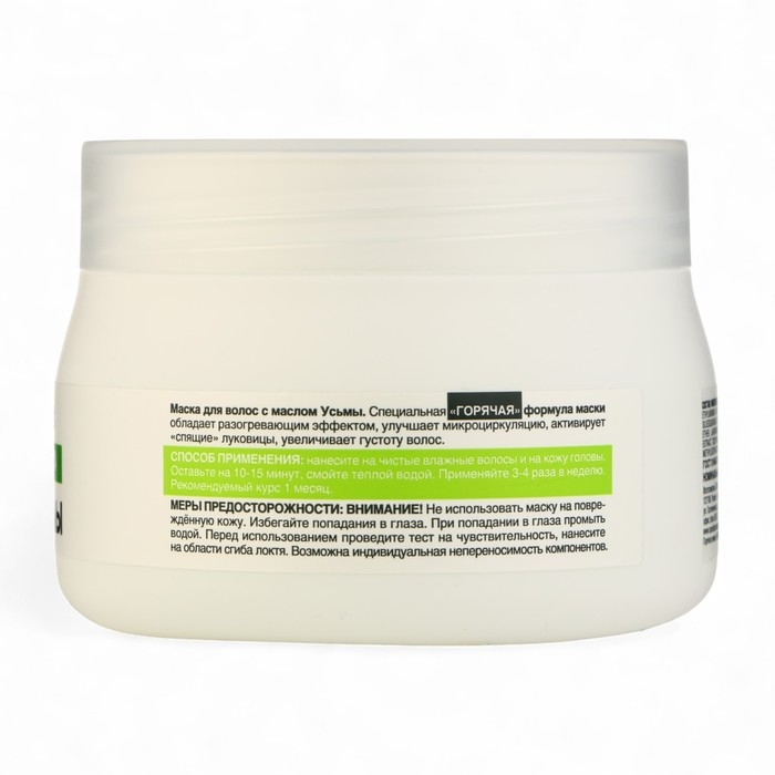 Применение маски: нанести на чистые влажные волосы и кожу головы, оставить на 10–15 минут, затем смыть тёплой водой. Использовать 3–4 раза в неделю в течение месяца. Не применять на повреждённой коже и избегать попадания в глаза. Перед использованием провести тест на чувствительность. Возможна индивидуальная непереносимость компонентов.