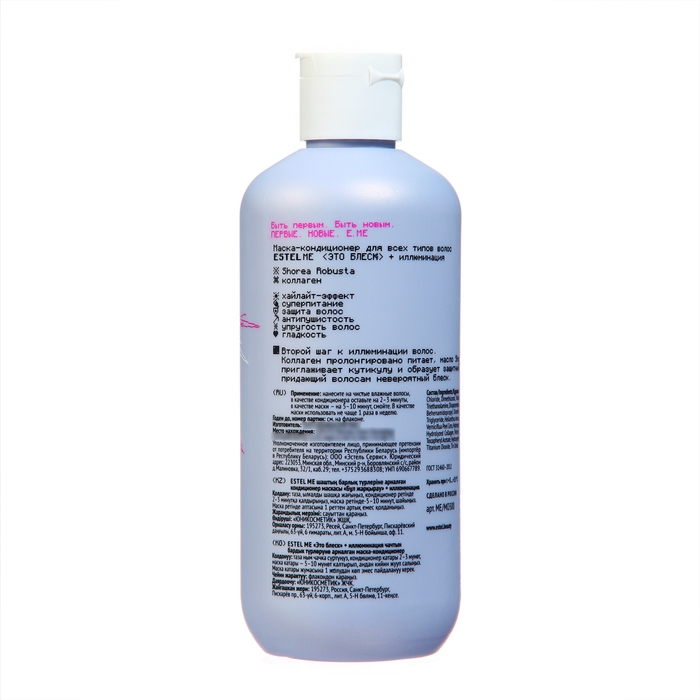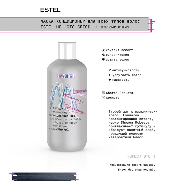 ESTEL Маска-кондиционер для волос ME Это блеск + иллюминация — это второй шаг к невероятному блеску волос. Благодаря коллагену, который продолжительно питает волосы, они становятся здоровыми и сияющими. Масло Shorea robusta, содержащееся в составе маски, приглаживает кутикулу и образует защитный слой, который придает волосам невероятный блеск.