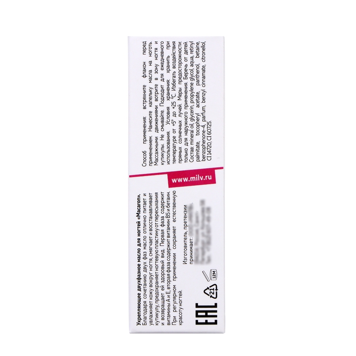Способ применения: встряхните флакон перед применением. Нанесите капельку масла на ноготь. Массажными движениями вотрите в зону ногтя и кутикулы. Не смывайте. Подходит для ежедневного использования.