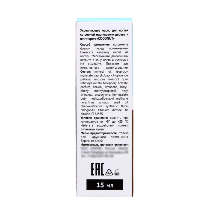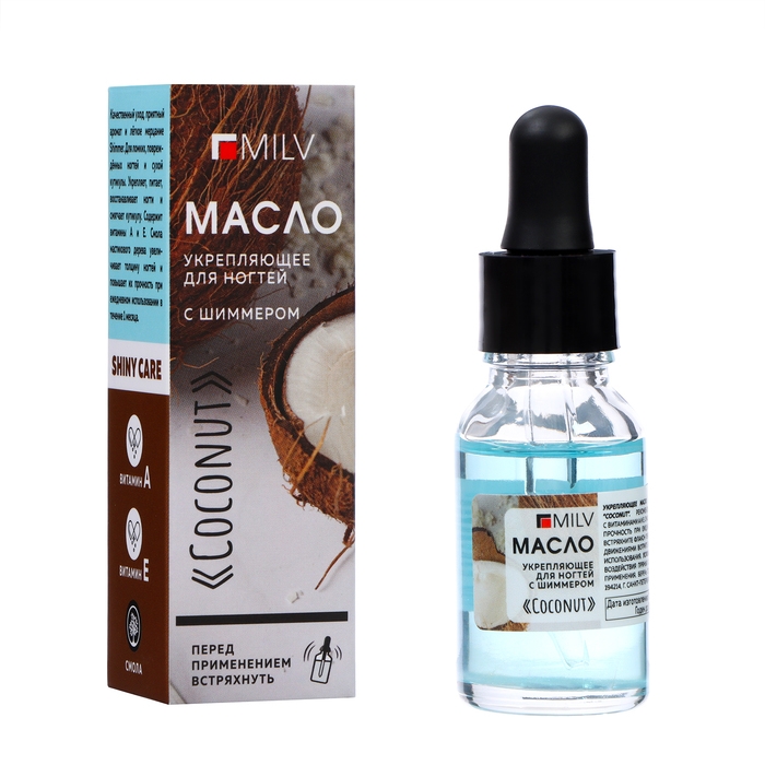 Масло для ногтей укрепляющее со смолой мастикового дерева и шиммером MILV кокос, 15 мл