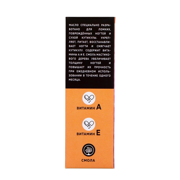Быстро впитывается, оставляет приятное ощущение и сладкий аромат ванили, имбиря и сандала. Содержит витамины А и Е. Смола мастикового дерева в составе масла увеличивает толщину ногтей и повышает их прочность при ежедневном использовании в течение 1 месяца. Рекомендовано для ломких, повреждённых ногтей и сухой кутикулы.