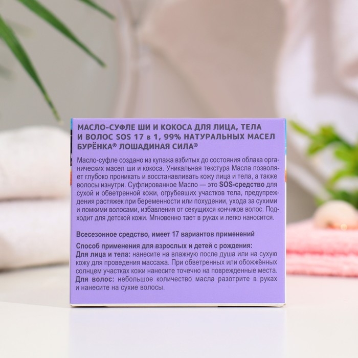Суфлированное масло — это SOS-средство для сухой и обветренной кожи, огрубевших участков тела, предупреждения растяжек при беременности или похудении, ухода за сухими и ломкими волосами, избавления от секущихся кончиков волос. Подходит для детской кожи. Мгновенно тает в руках и легко наносится.