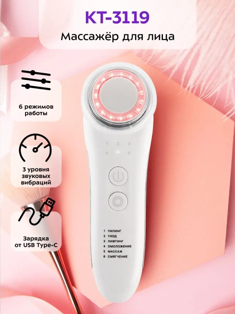 Массажер KT-3119 может воздействовать на кожу синим и красным светом. Синее излучение нормализует работу сальных желез, уменьшает видимость пор. Красный свет предназначен для укрепления стенок сосудов, выравнивания тона кожи, восстановления ее гладкости, эластичности и упругости.