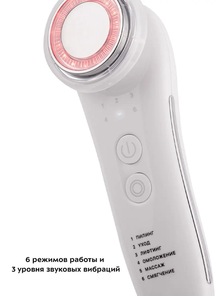 Массажер для лица Kitfort KT-3119 поможет подтянуть кожу, разгладить рельеф кожи, замедлить появление морщин. Массажер оснащен 6 режимами работы: «Пилинг», «Уход», «Лифтинг», «Омоложение», «Массаж», «Смягчение». В режимах комбинируется воздействие звуковых и ультразвуковых вибраций, тепла, микротоков и света. В каждом режиме вы можете выбрать один из 3 уровней воздействия звуковыми вибрациями. Управление массажером происходит двумя кнопками, расположенными на корпусе прибора. Устройство начнет работу, когда электроды на корпусе массажера соприкасаются с рукой, а электроды на рабочей поверхности прибора соприкасаются с кожей лица.
