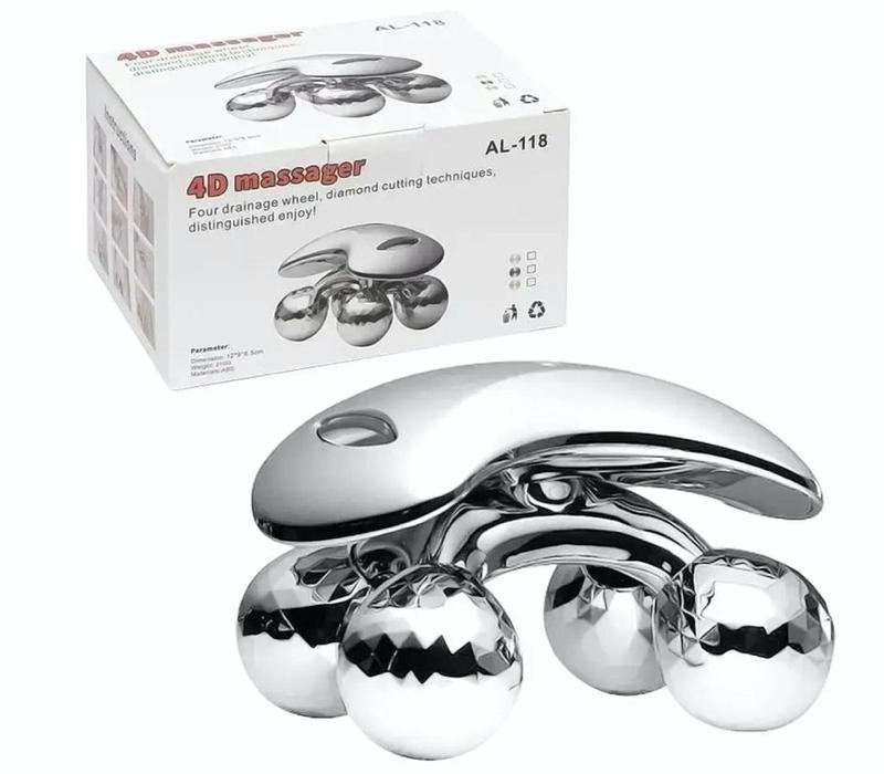 4D массажёр – роликовый лифтинговый массажёр для точечного массажа и для создания подтянутых линий контуров тела, как в домашних условиях, так и в профессиональных массажных салонах. Оснащен четырьмя лимфодренажными сферами, которые расположены под углом 75 градусов и гарантируют самый эффективный массаж лица, шеи, талии и других частей тела, нуждающихся в лифтинге. Массажер помогает подтянуть контуры лица, избавиться от морщин, расстаться со вторым подбородком, избавиться от целлюлита. Вы можете воздействовать прибором на любые части тела, которые нуждаются в лифтинге. Под воздействием массажера ускоряется обмен веществ, благодаря чему быстрее выводятся токсины из кожных покровов. Все это положительно влияет на оздоровление подкожных тканей и эпидермиса.